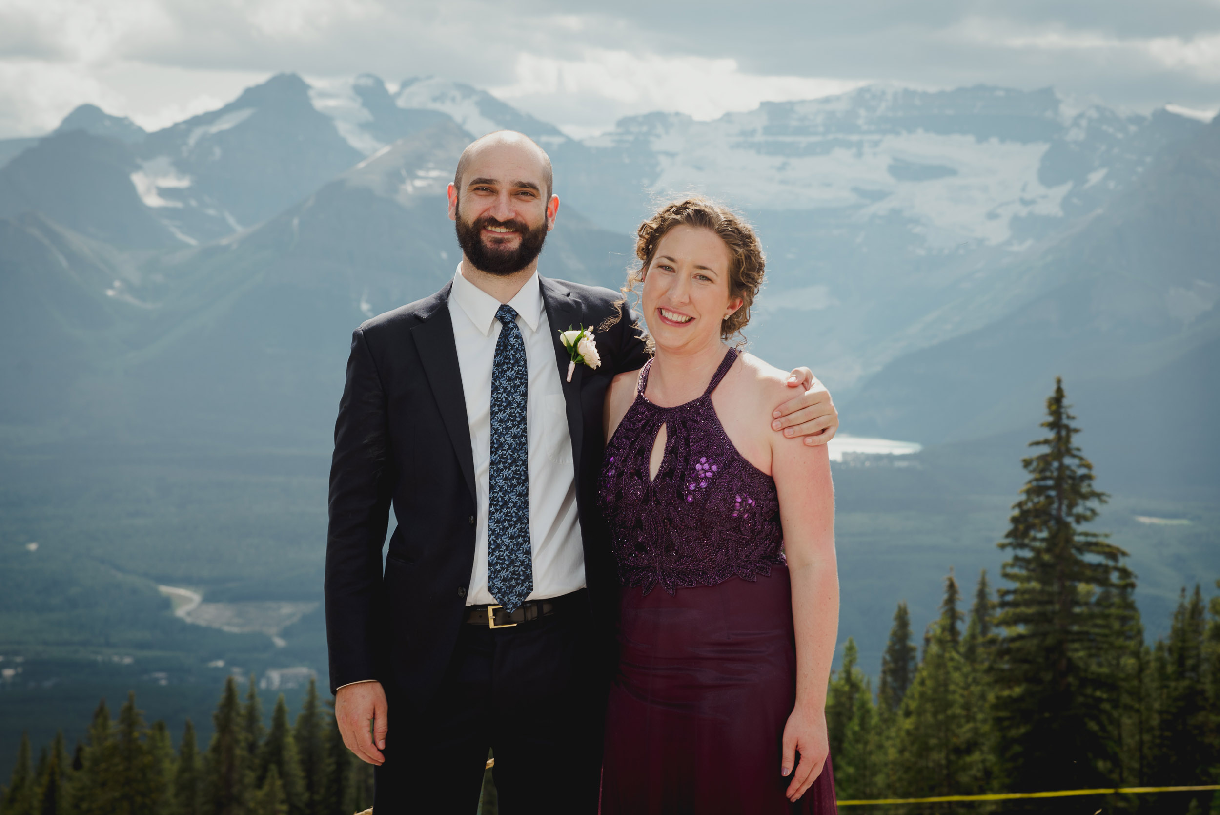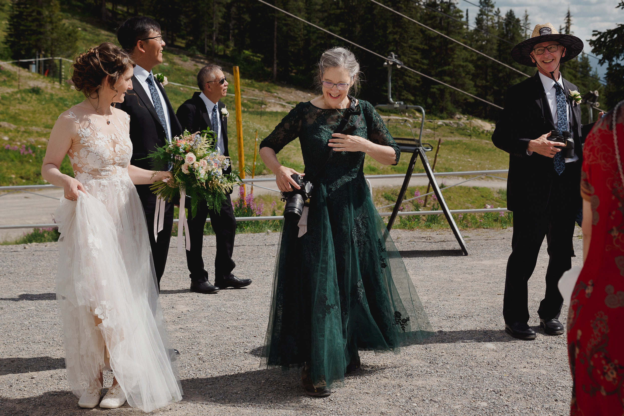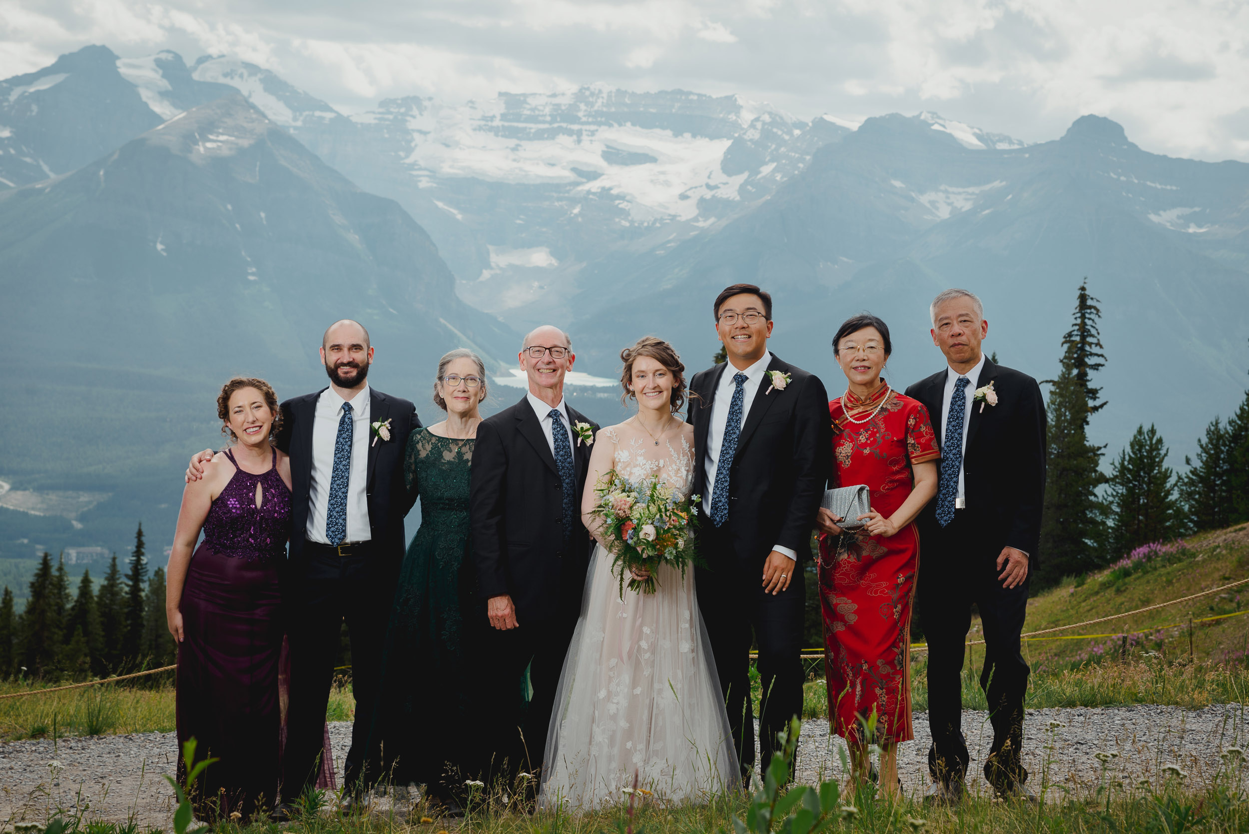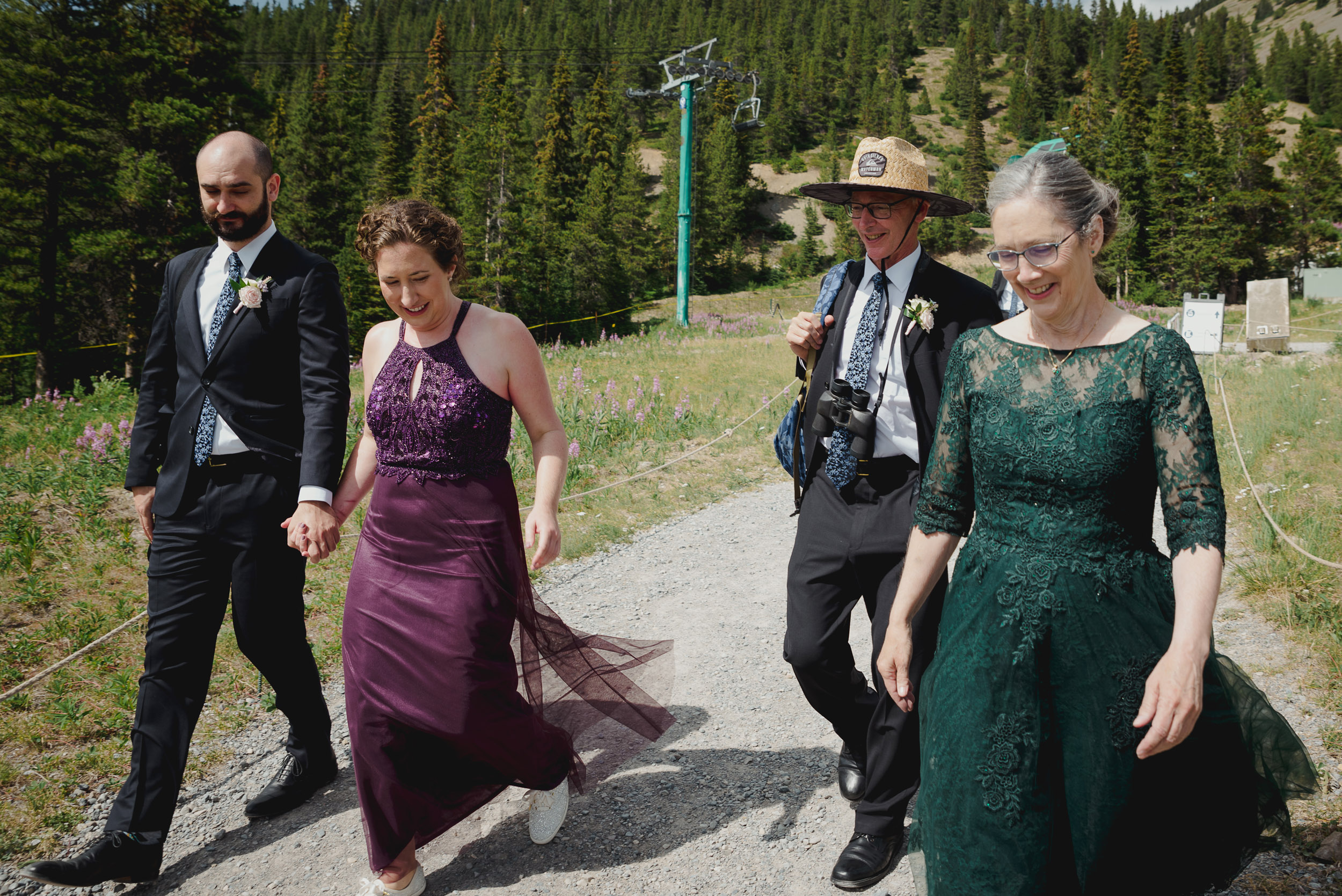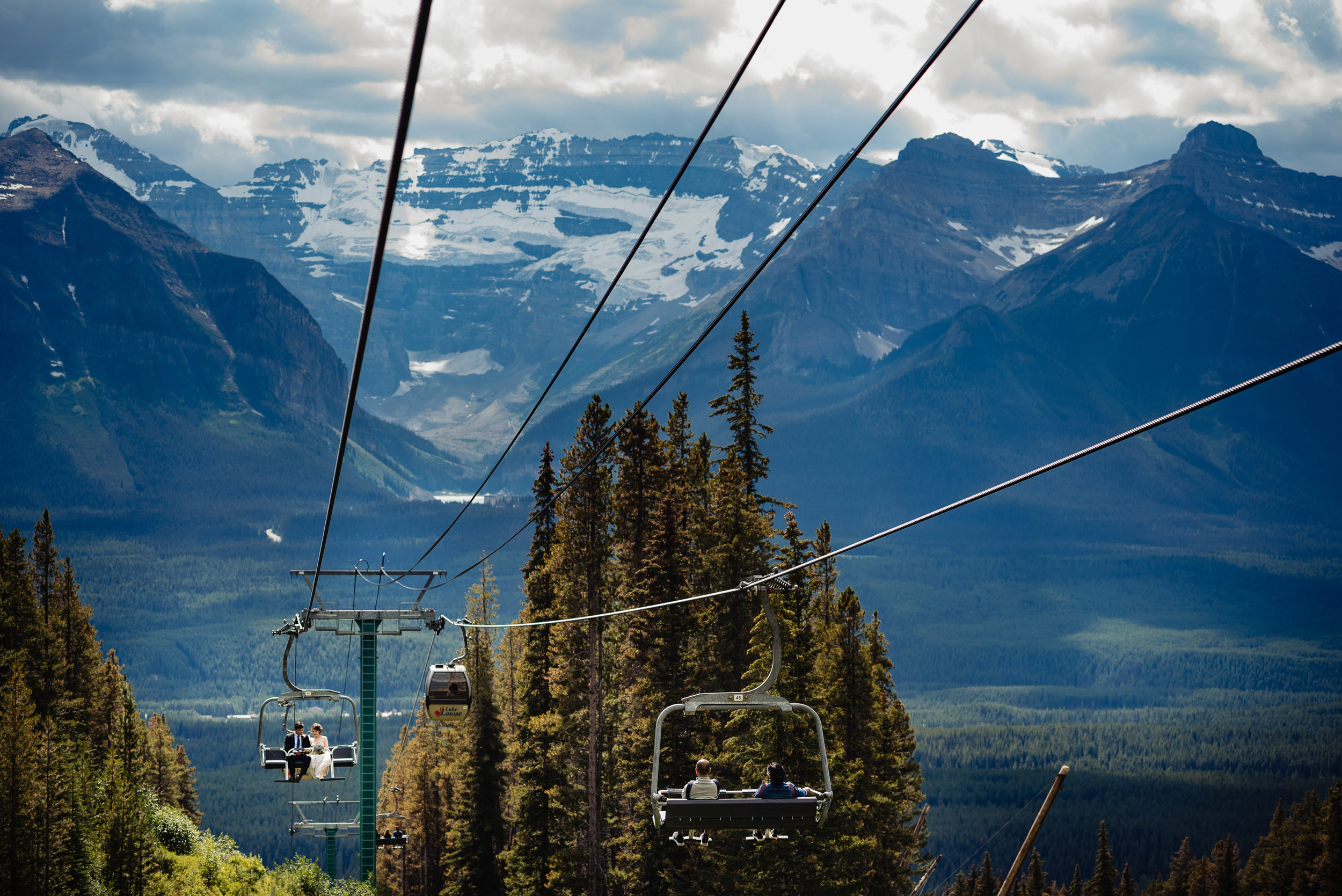 The adventure continues! After our ceremony, we piled into our rental cars and headed to the Lake Louise Ski Resort and Gondola. What better way to get stunning mountain vistas without actually needing to hike in our dresses and suits? In the distance, you can see Lake Louise where we got married.