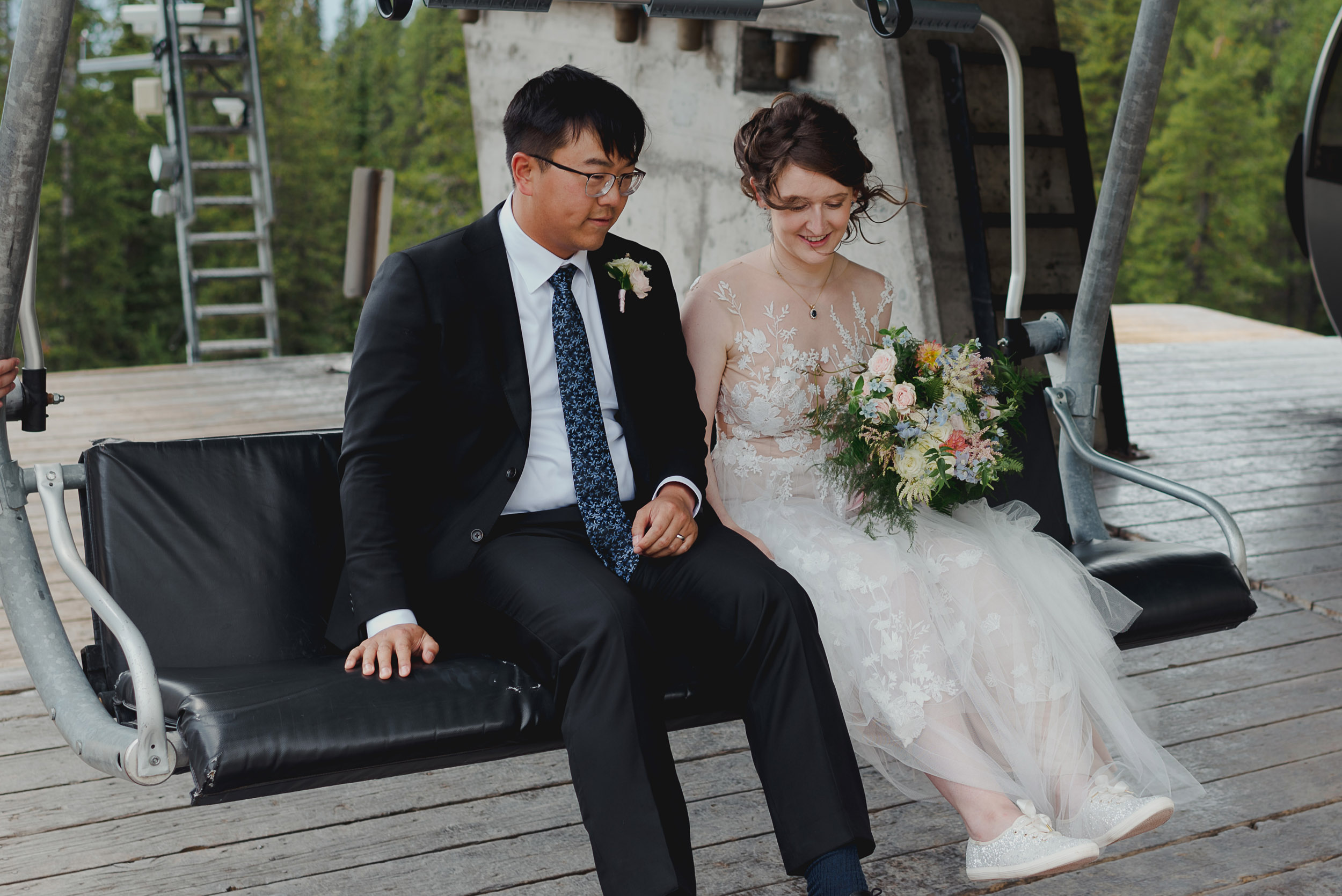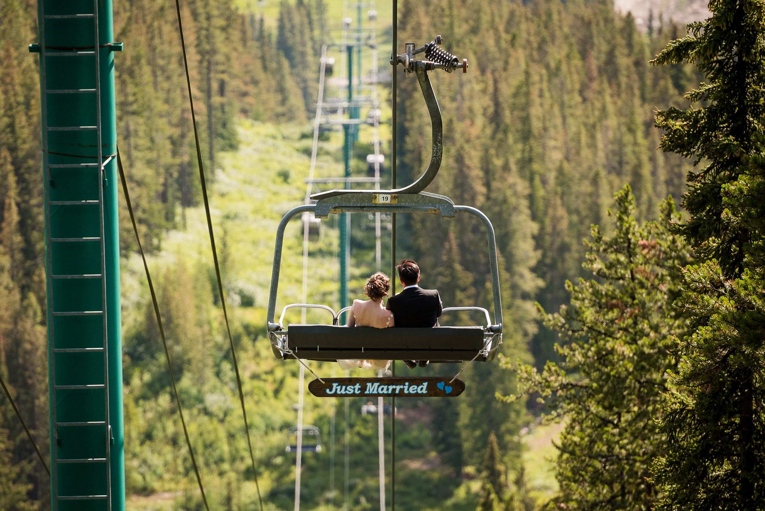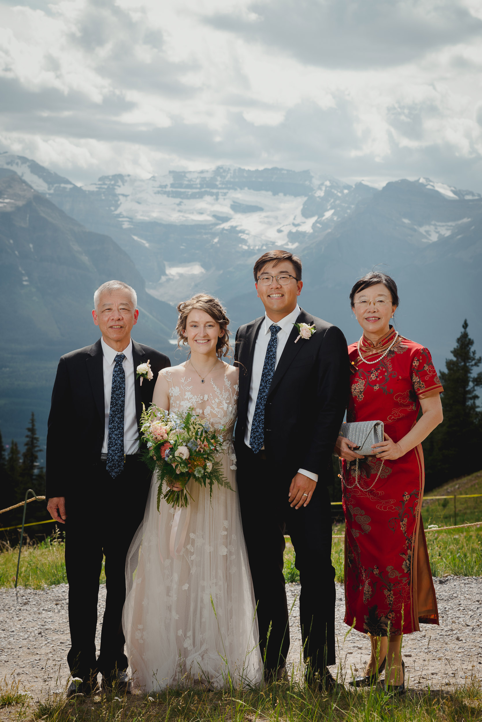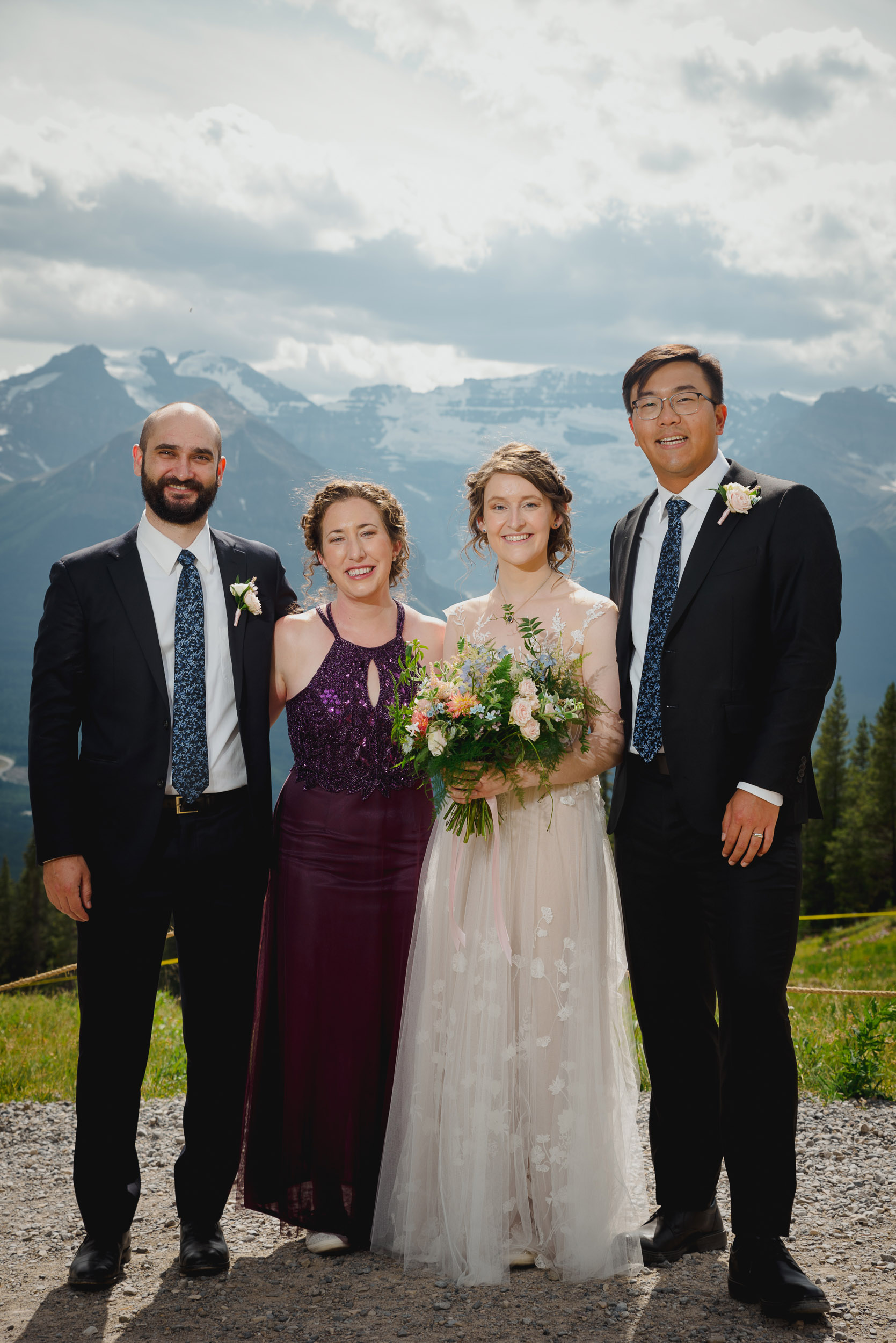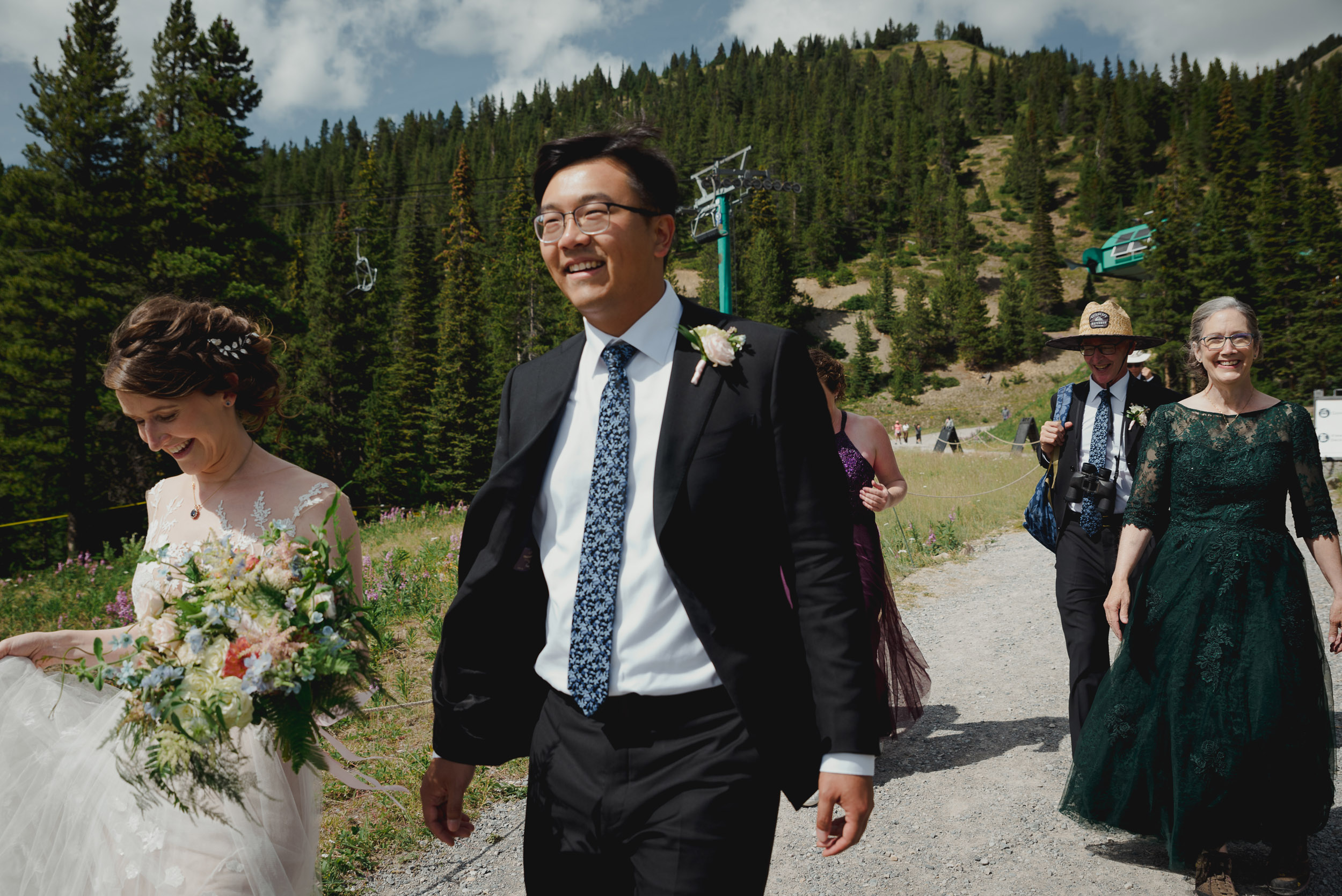 The adventure continues! After our ceremony, we piled into our rental cars and headed to the Lake Louise Ski Resort and Gondola. What better way to get stunning mountain vistas without actually needing to hike in our dresses and suits? In the distance, you can see Lake Louise where we got married.