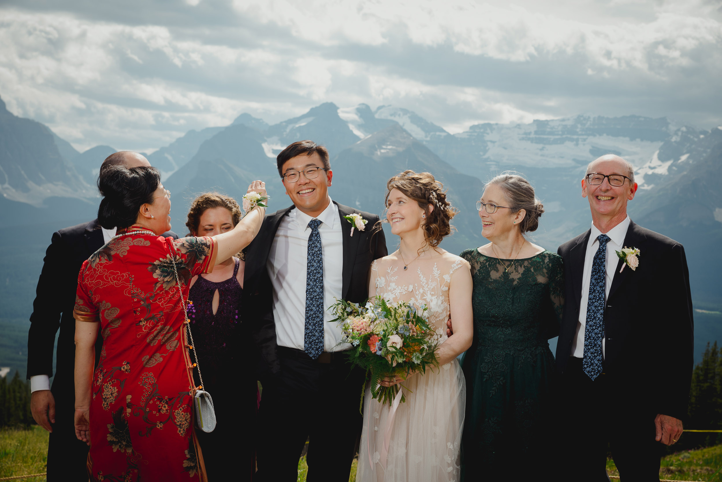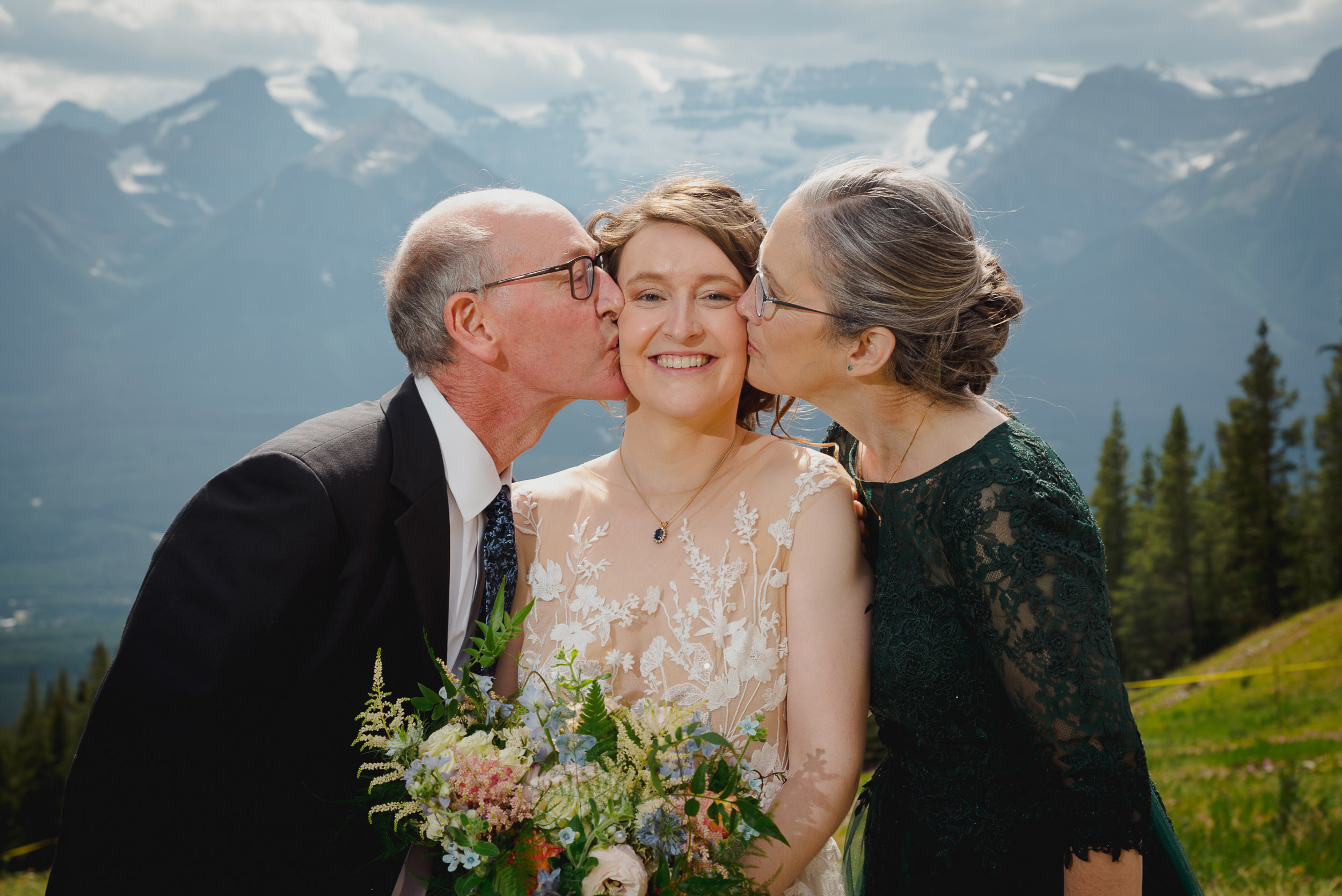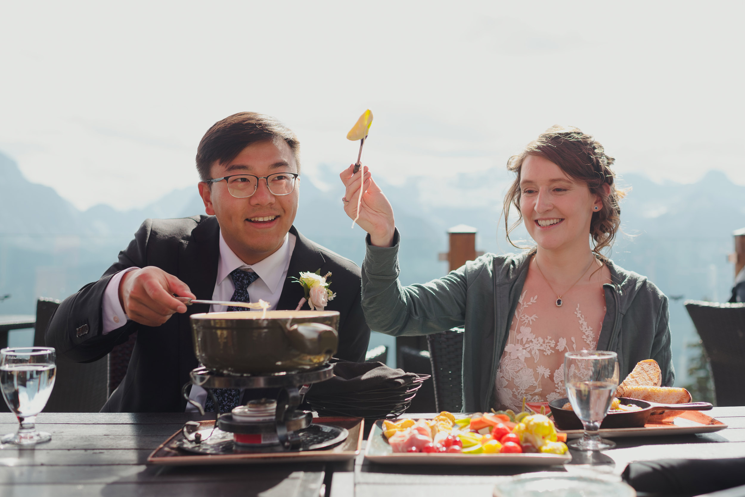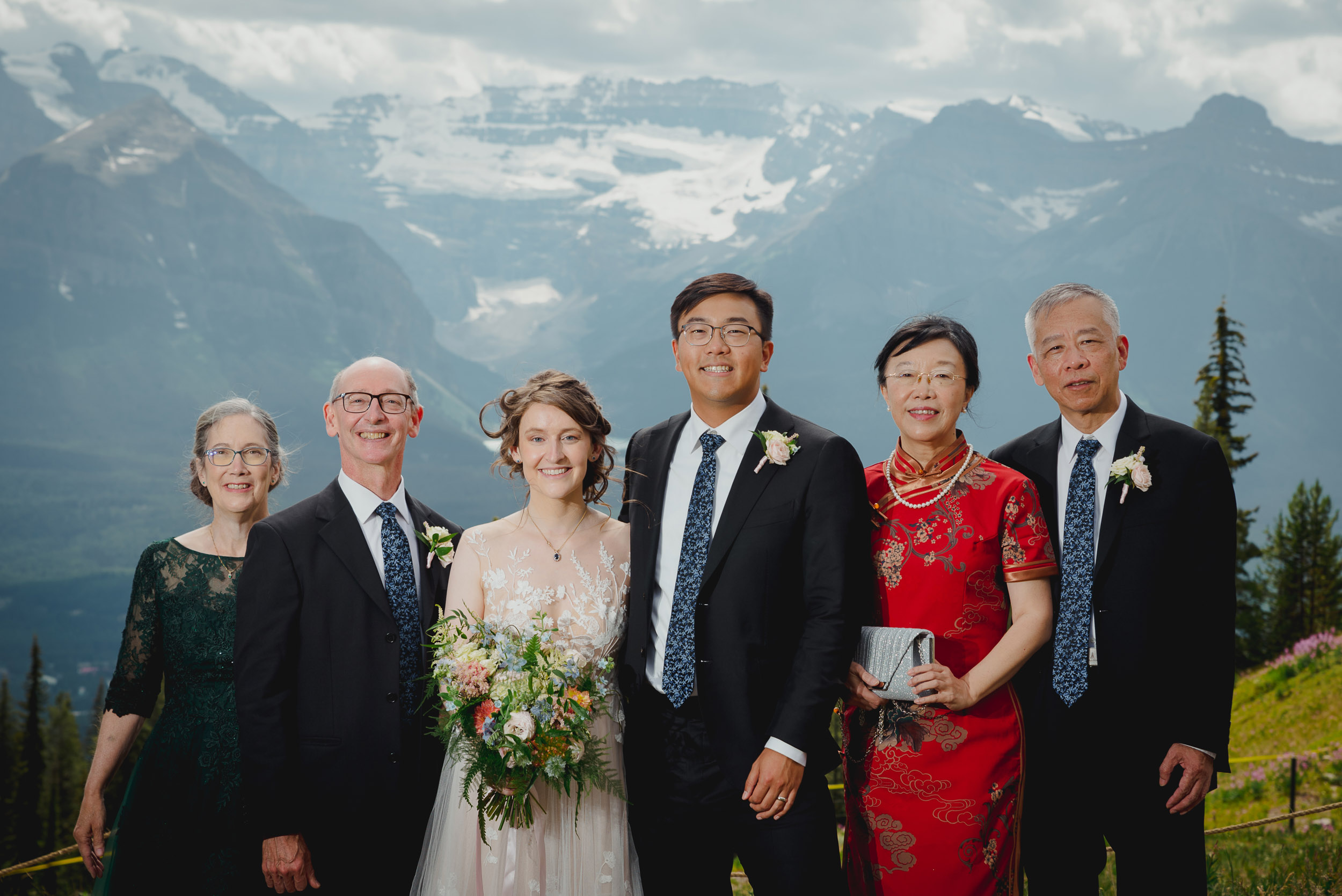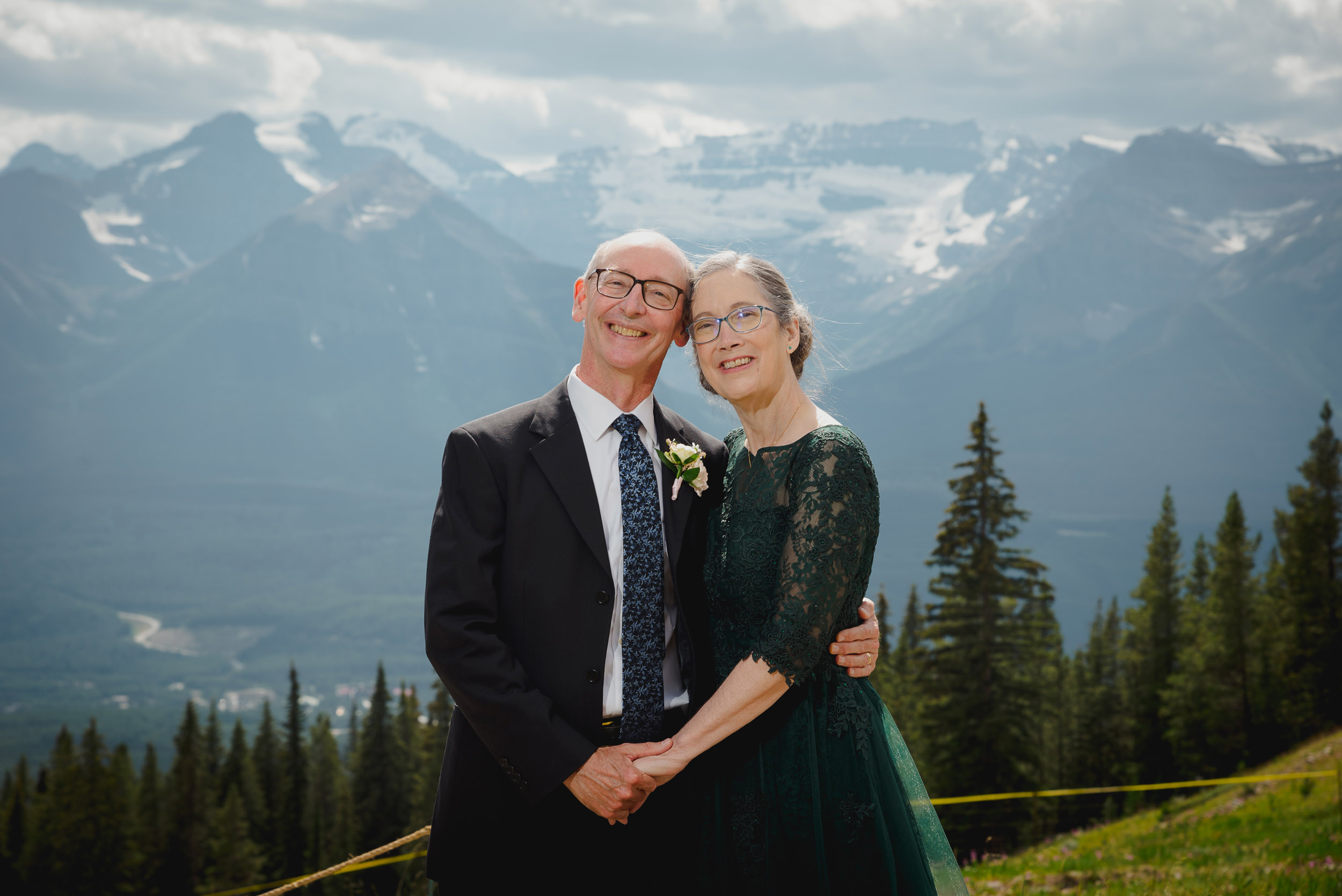 The adventure continues! After our ceremony, we piled into our rental cars and headed to the Lake Louise Ski Resort and Gondola. What better way to get stunning mountain vistas without actually needing to hike in our dresses and suits? In the distance, you can see Lake Louise where we got married.