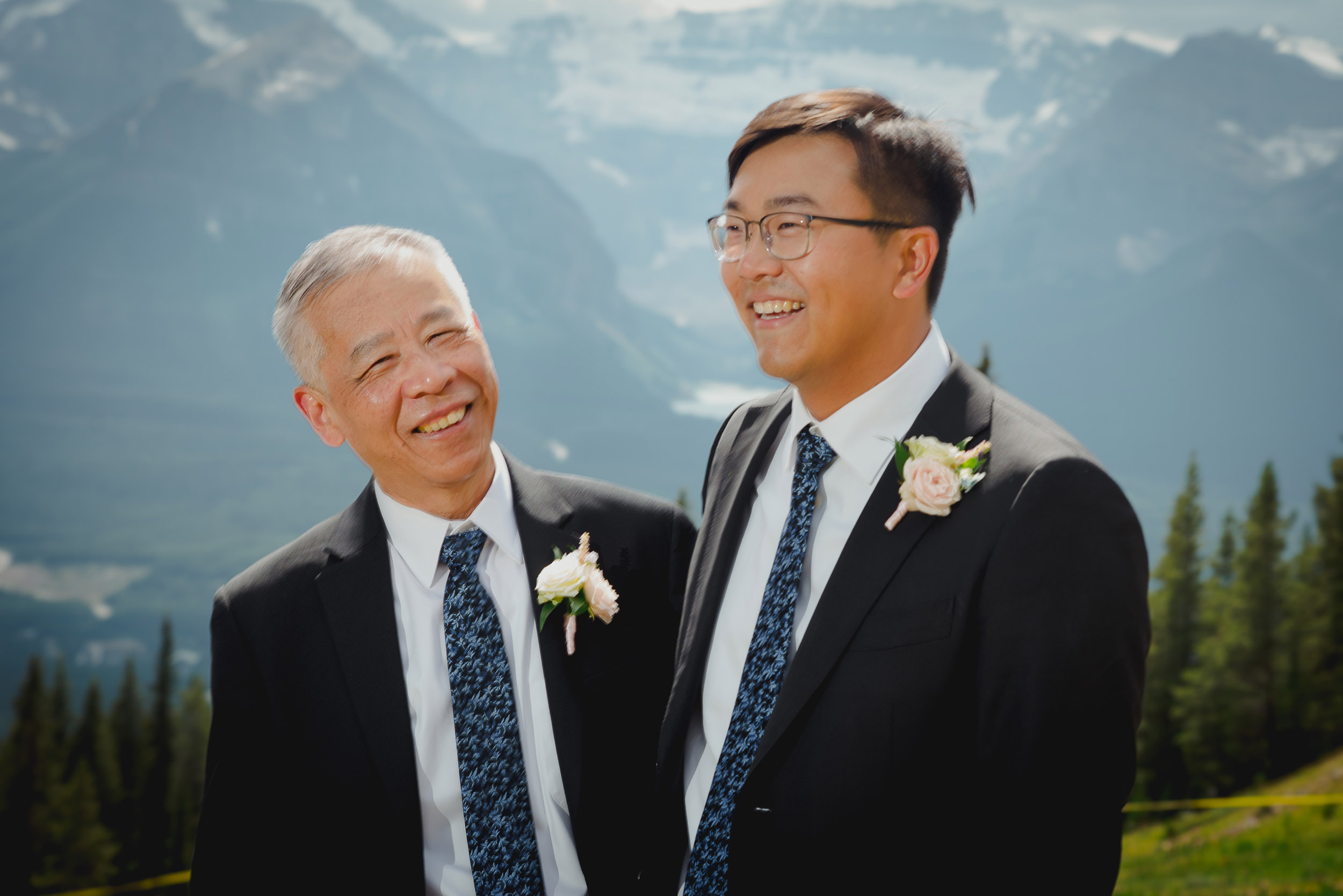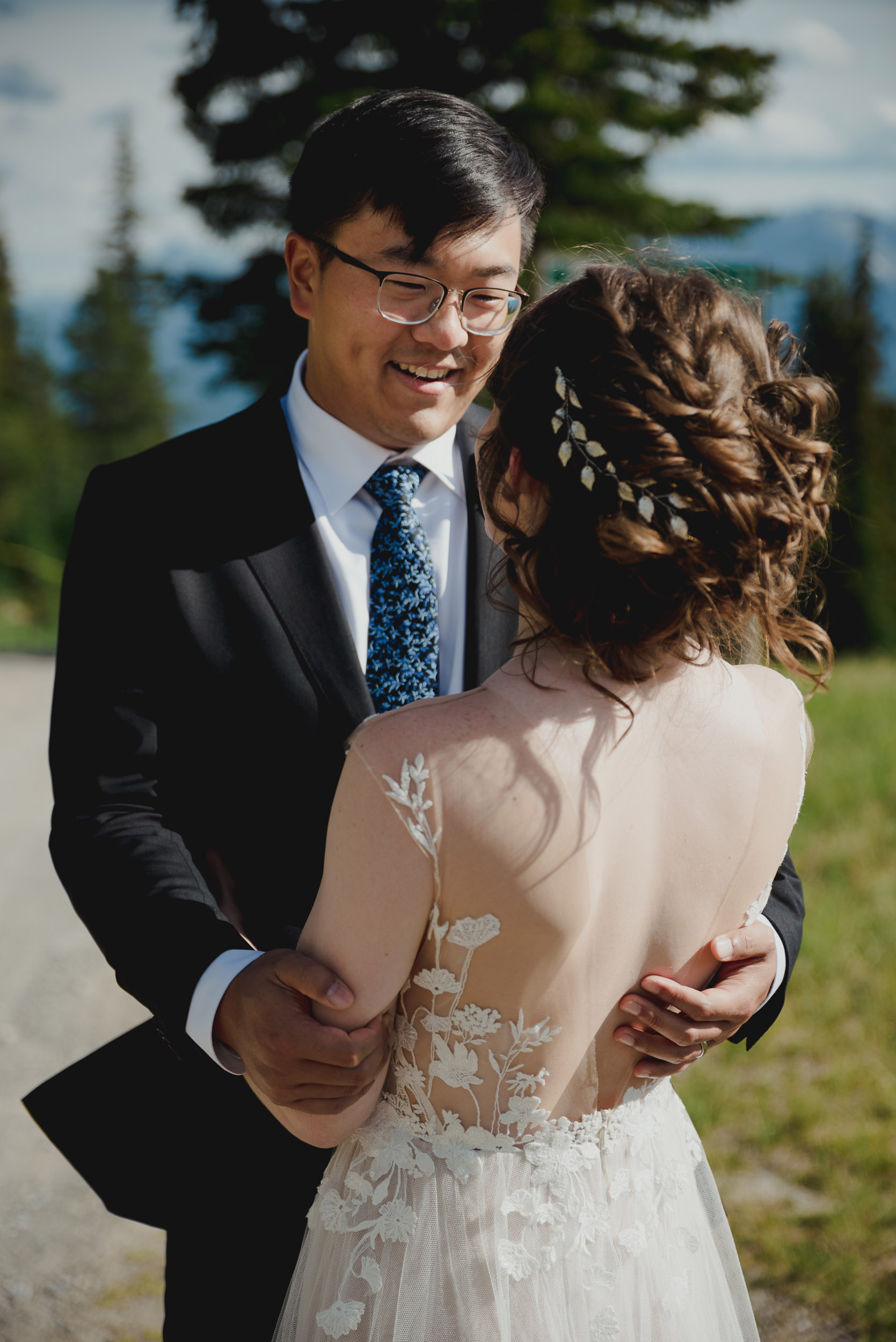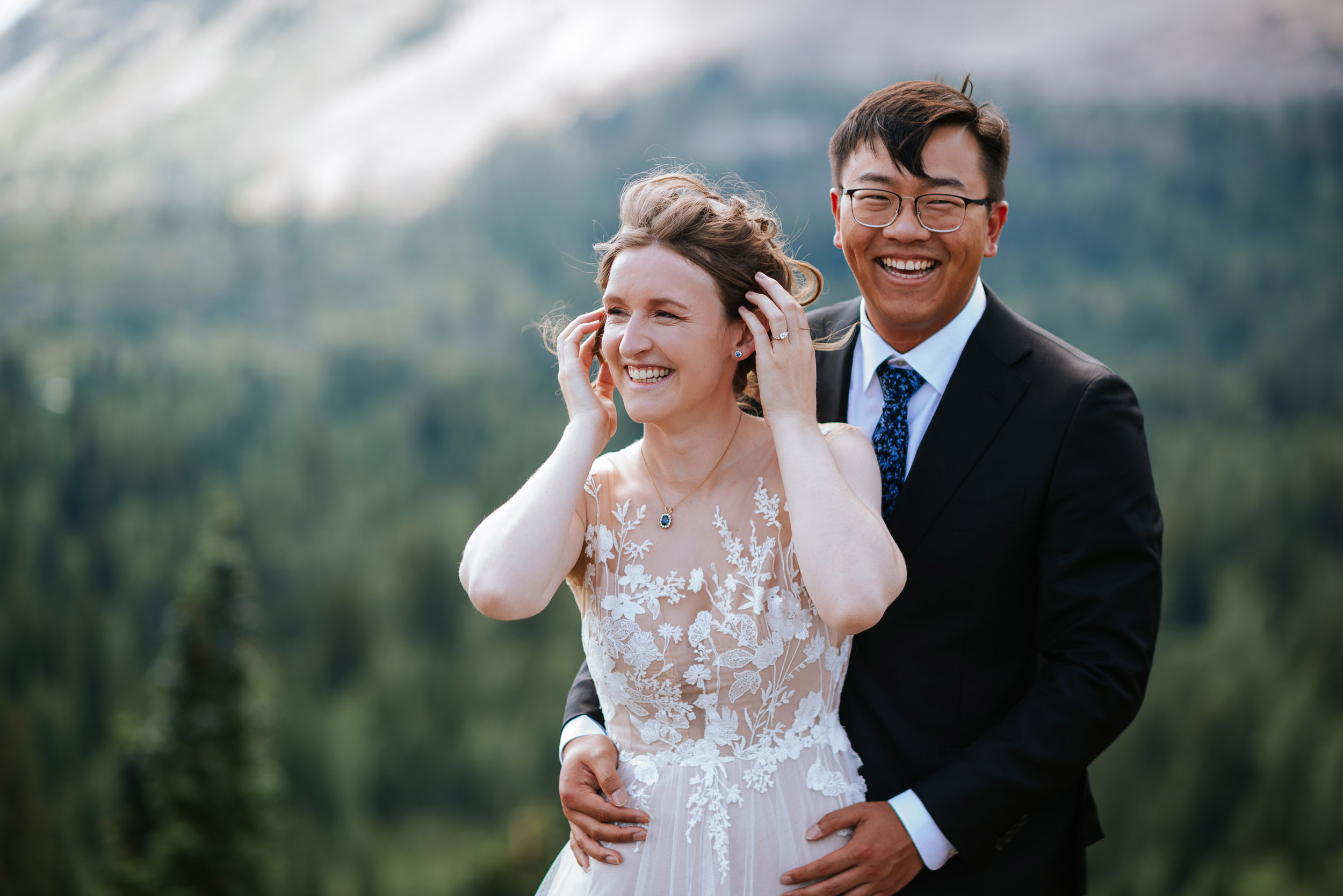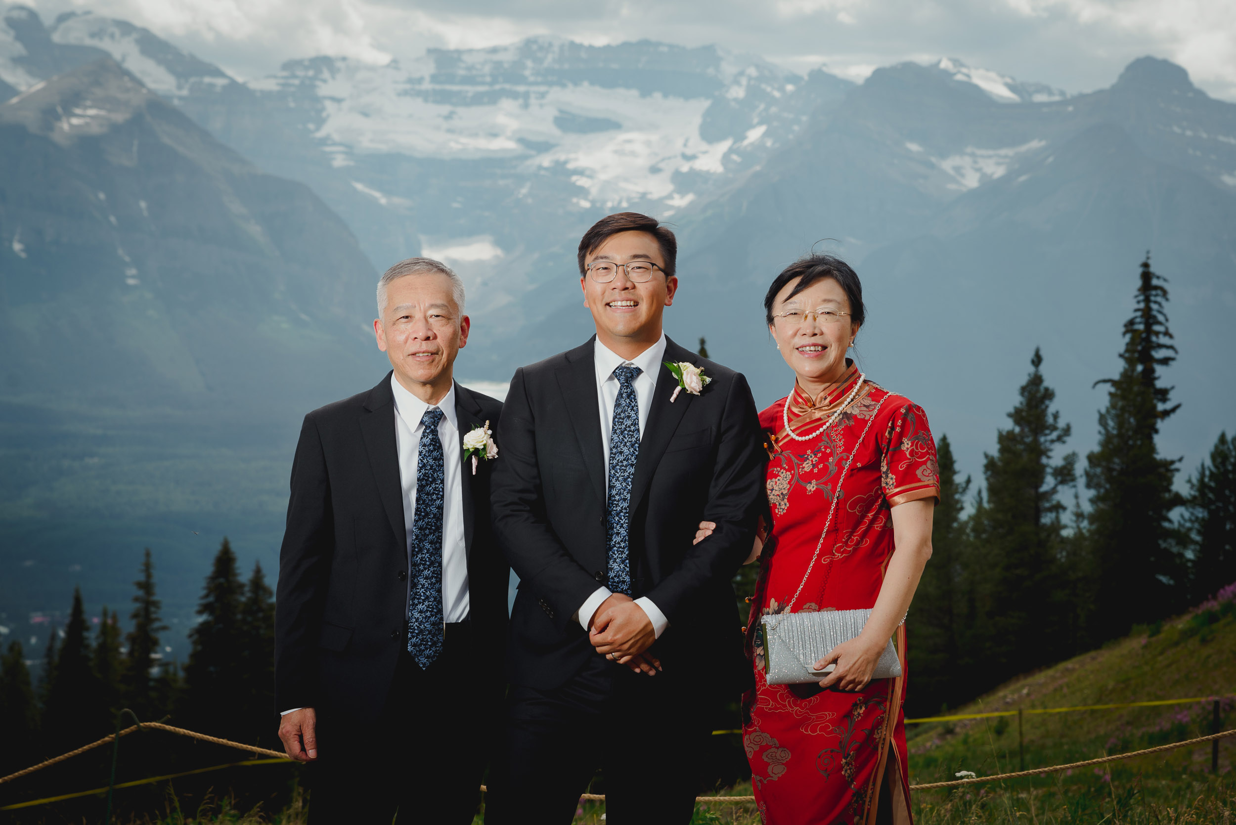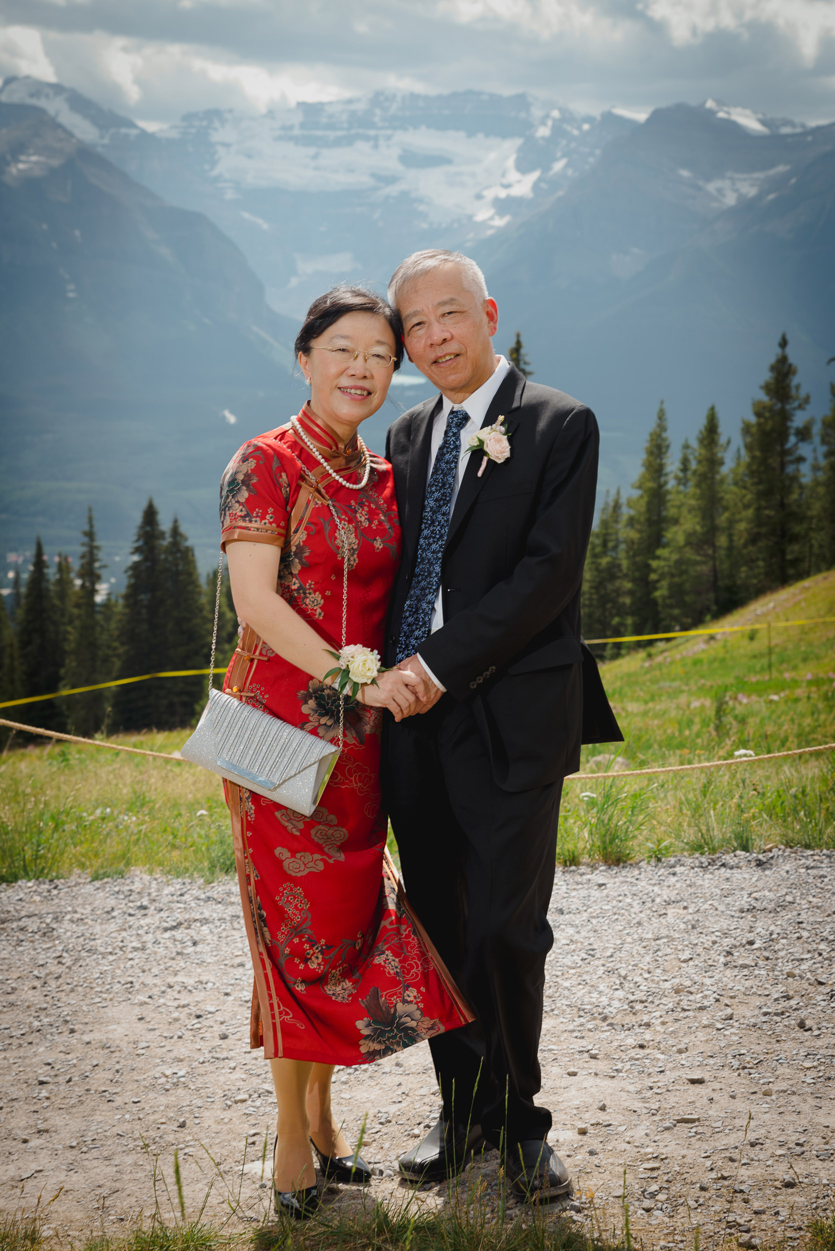 The adventure continues! After our ceremony, we piled into our rental cars and headed to the Lake Louise Ski Resort and Gondola. What better way to get stunning mountain vistas without actually needing to hike in our dresses and suits? In the distance, you can see Lake Louise where we got married.