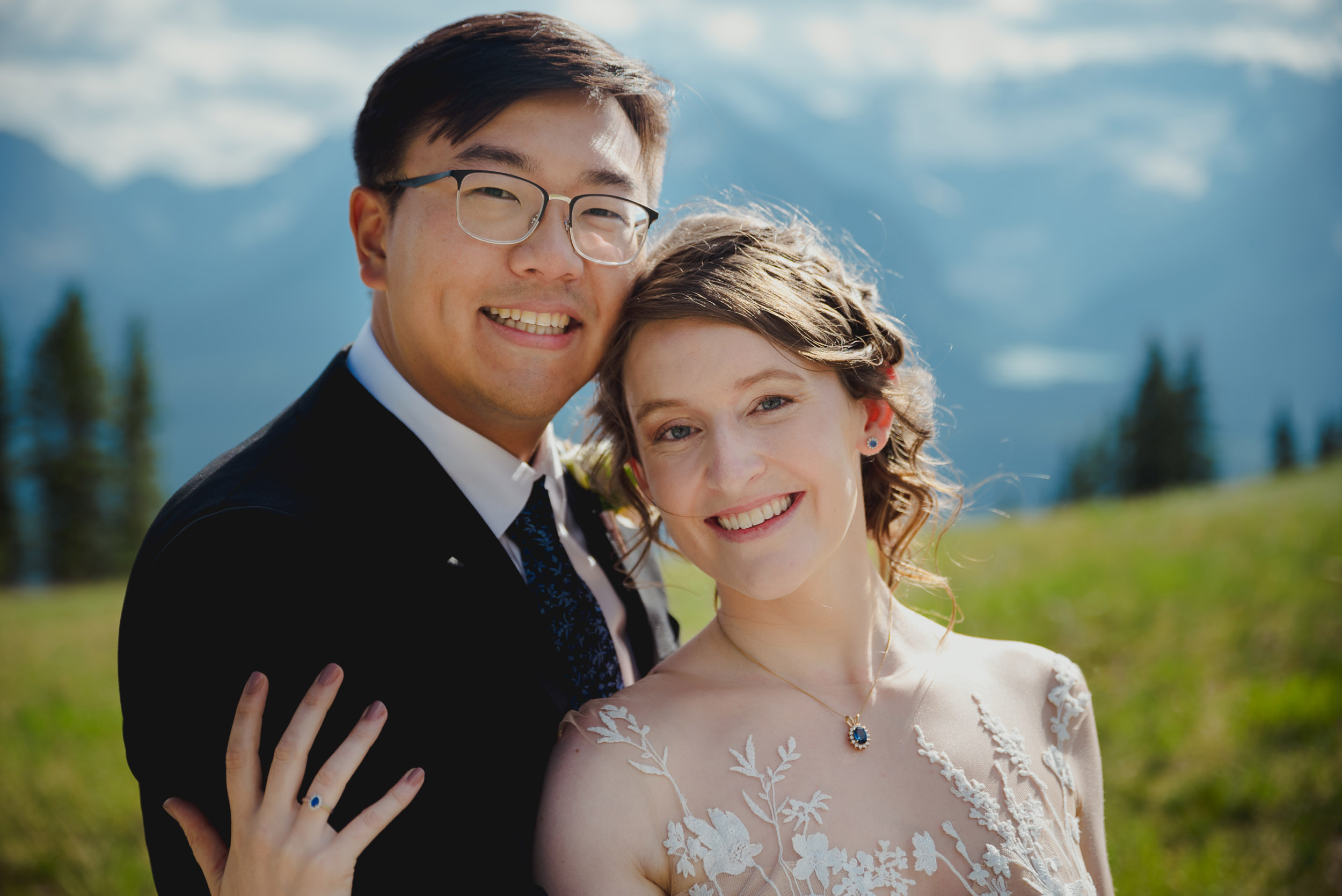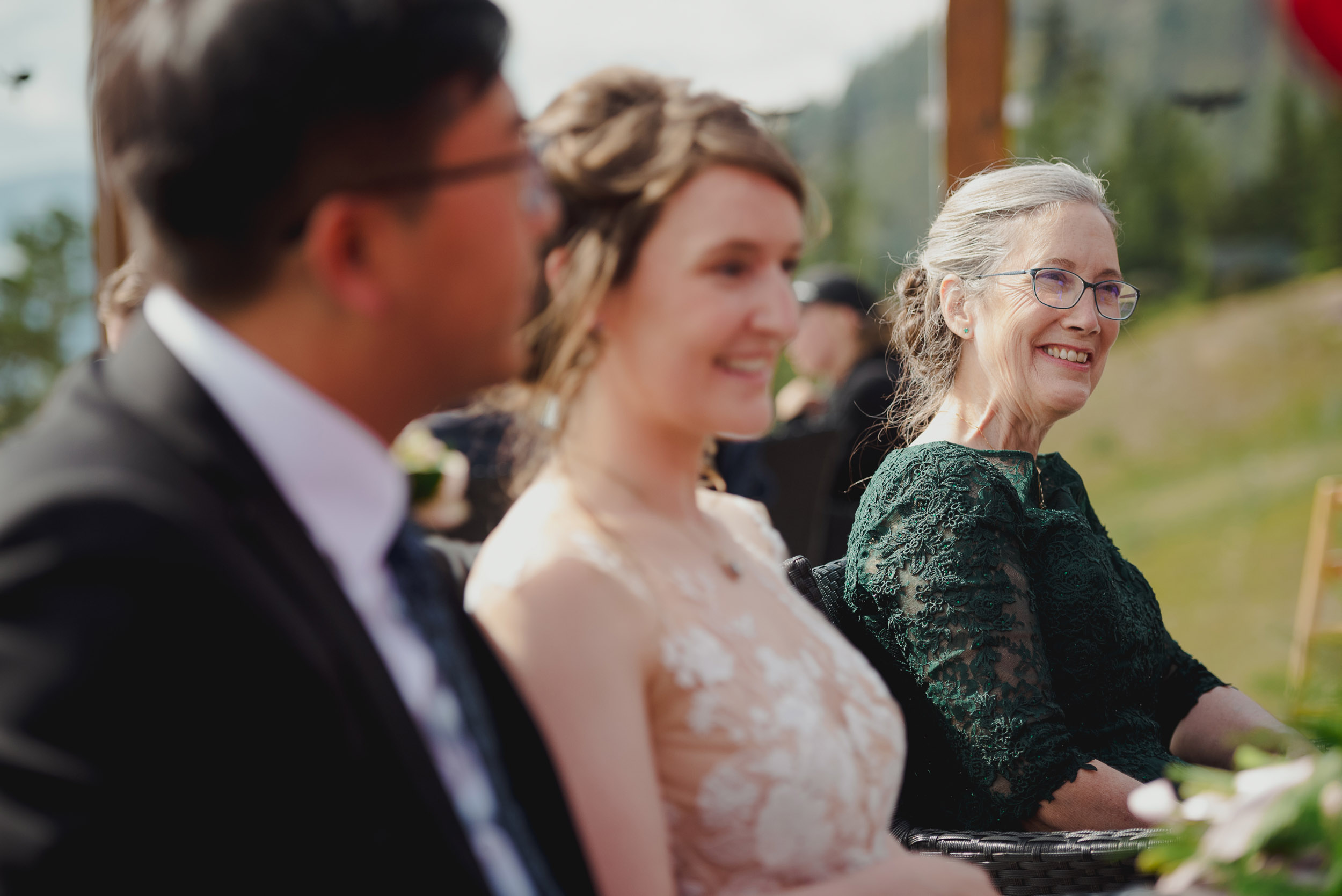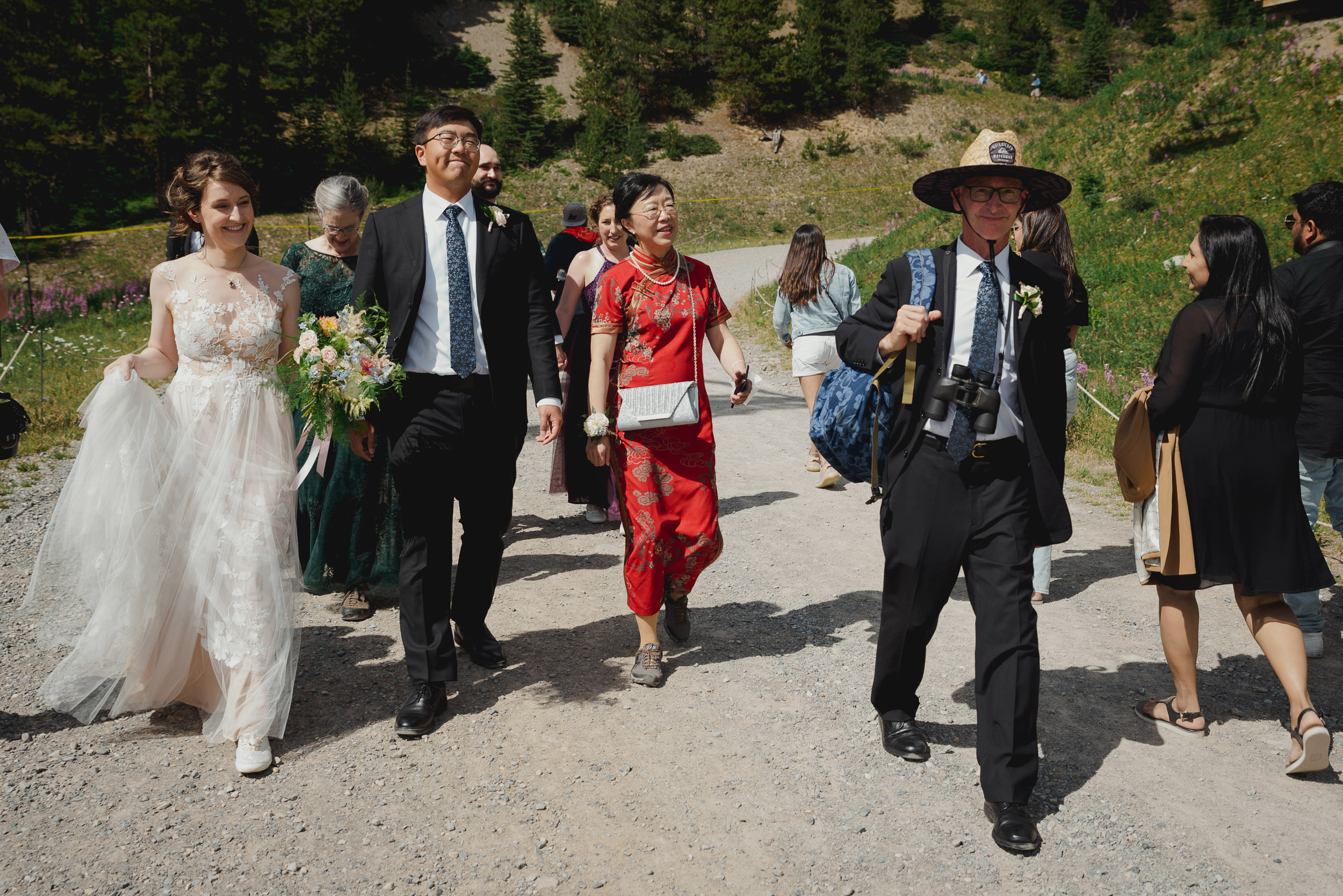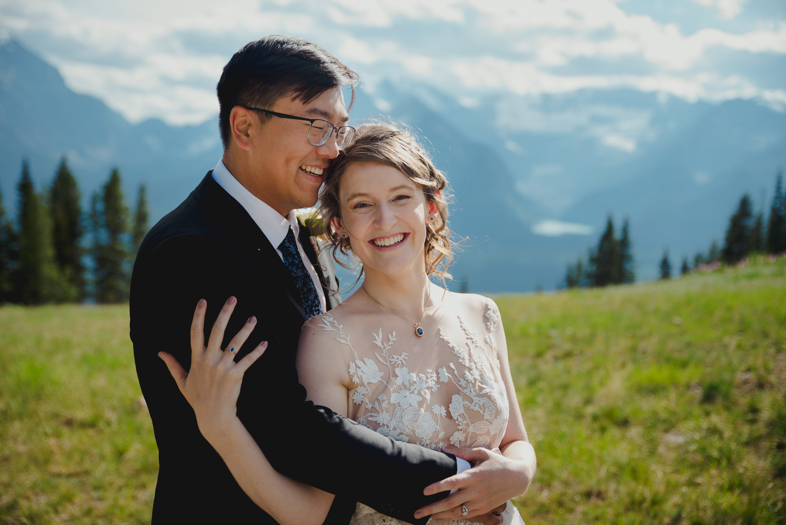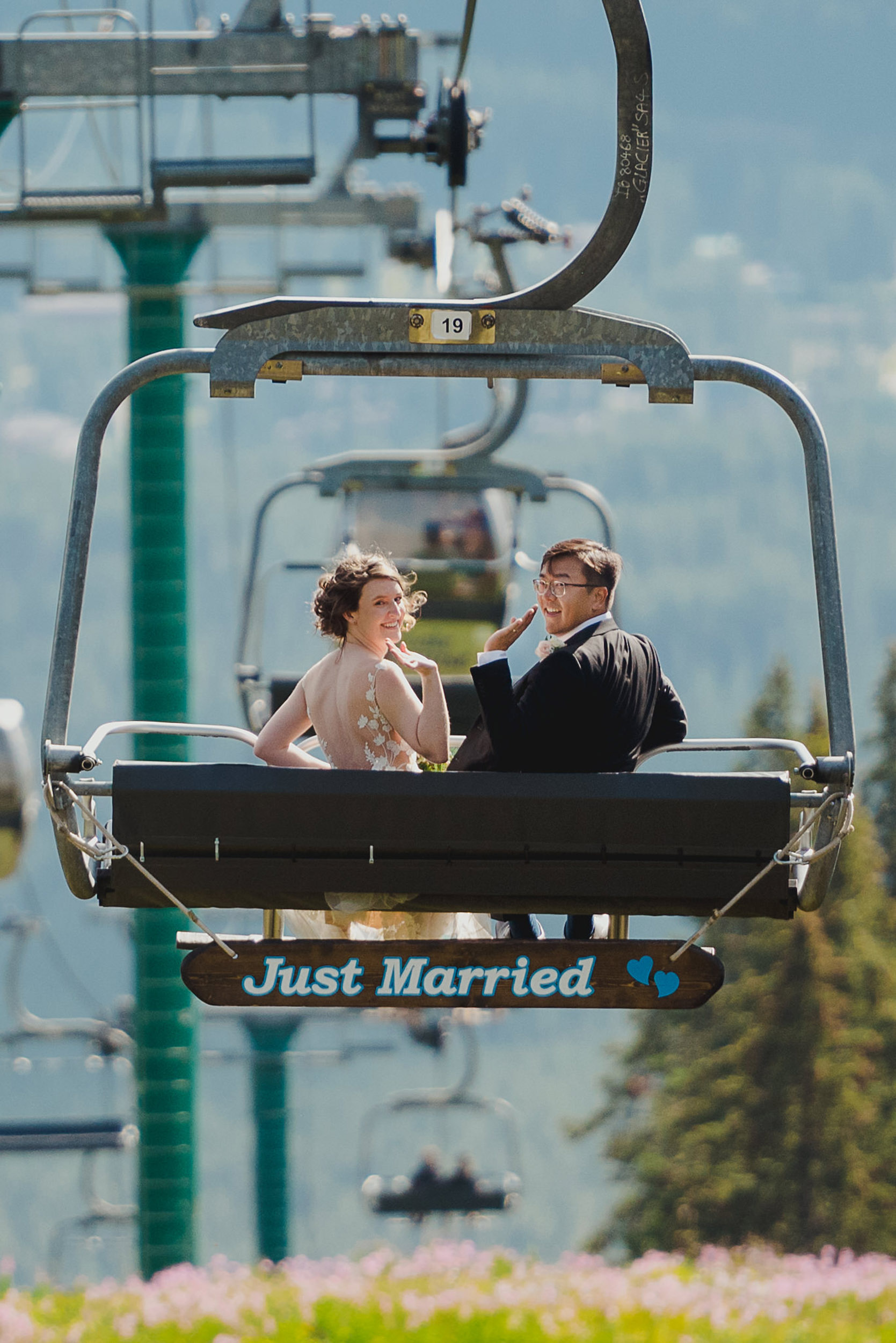 The adventure continues! After our ceremony, we piled into our rental cars and headed to the Lake Louise Ski Resort and Gondola. What better way to get stunning mountain vistas without actually needing to hike in our dresses and suits? In the distance, you can see Lake Louise where we got married.