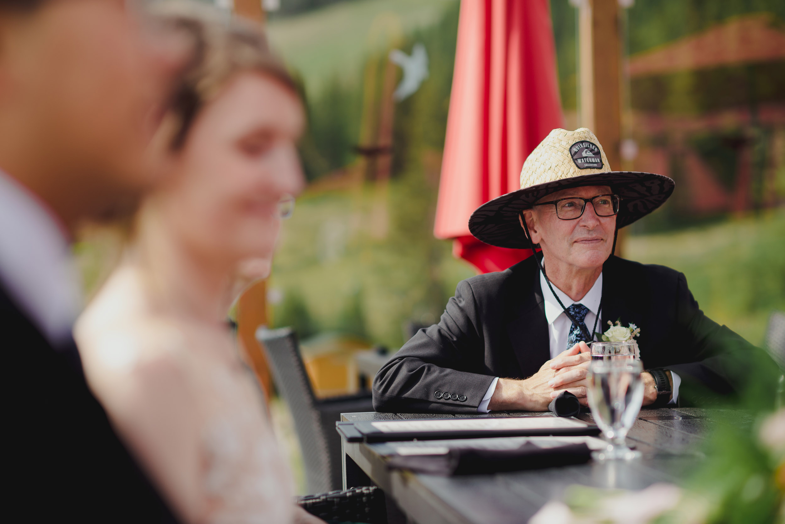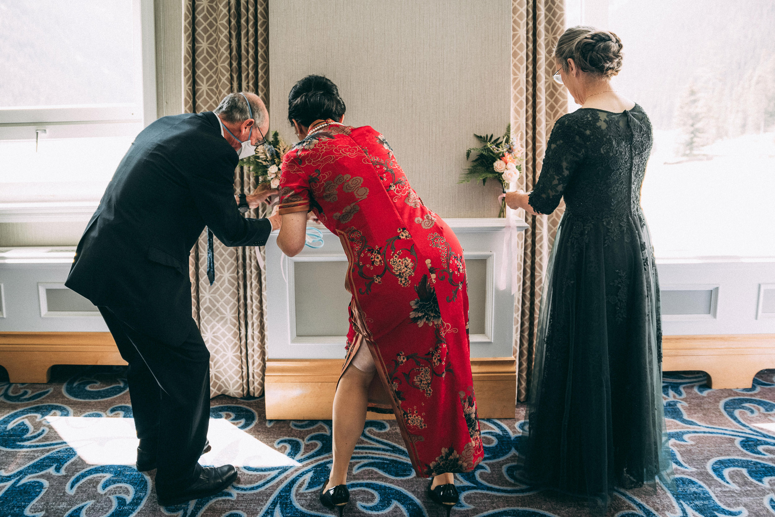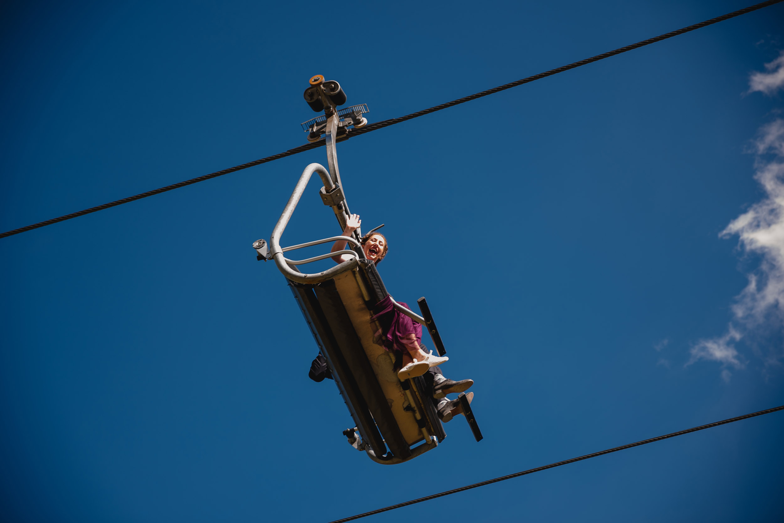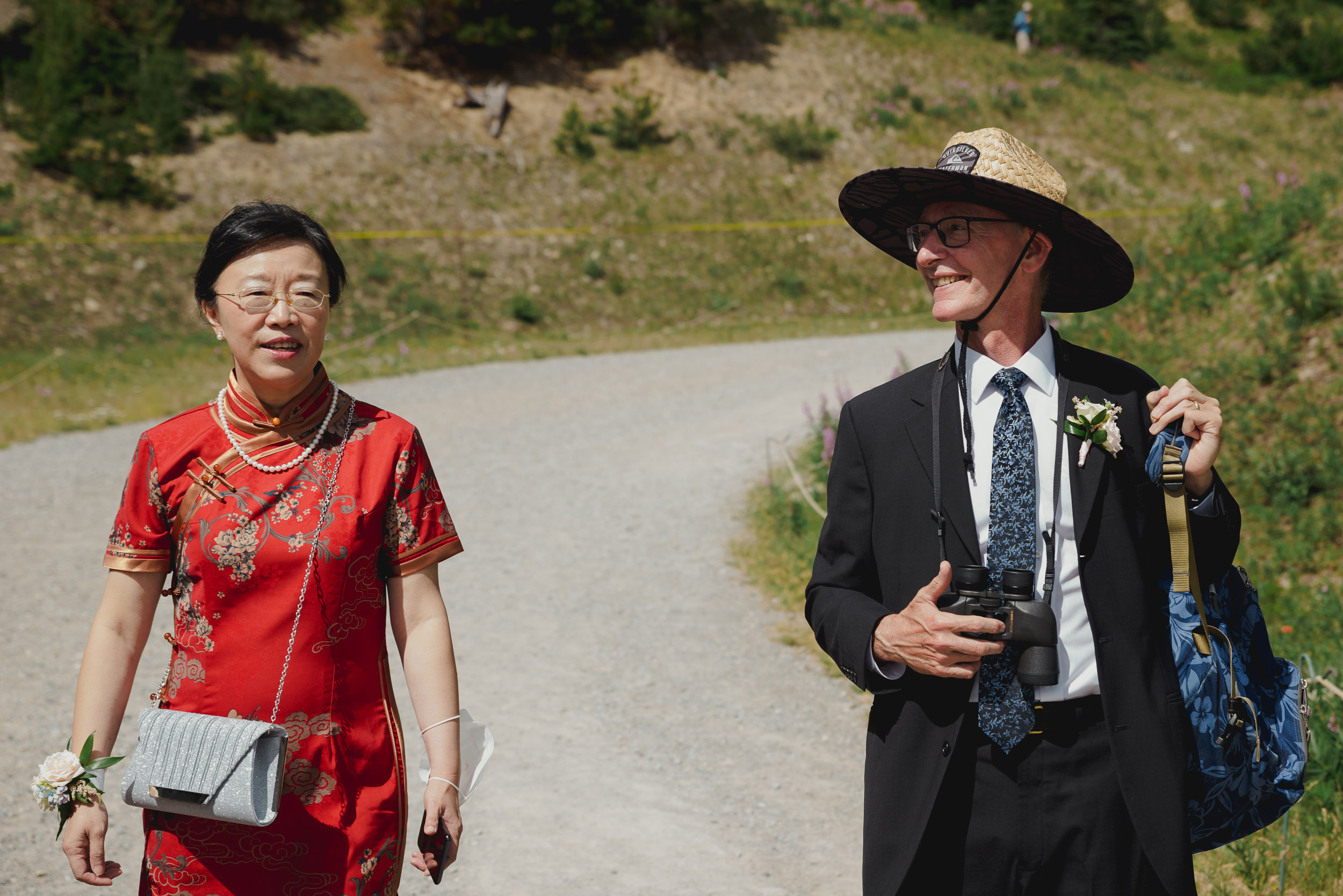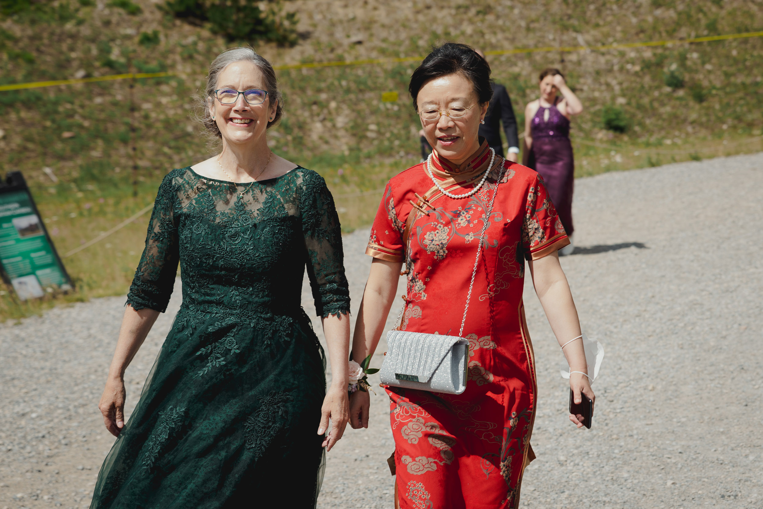 The adventure continues! After our ceremony, we piled into our rental cars and headed to the Lake Louise Ski Resort and Gondola. What better way to get stunning mountain vistas without actually needing to hike in our dresses and suits? In the distance, you can see Lake Louise where we got married.