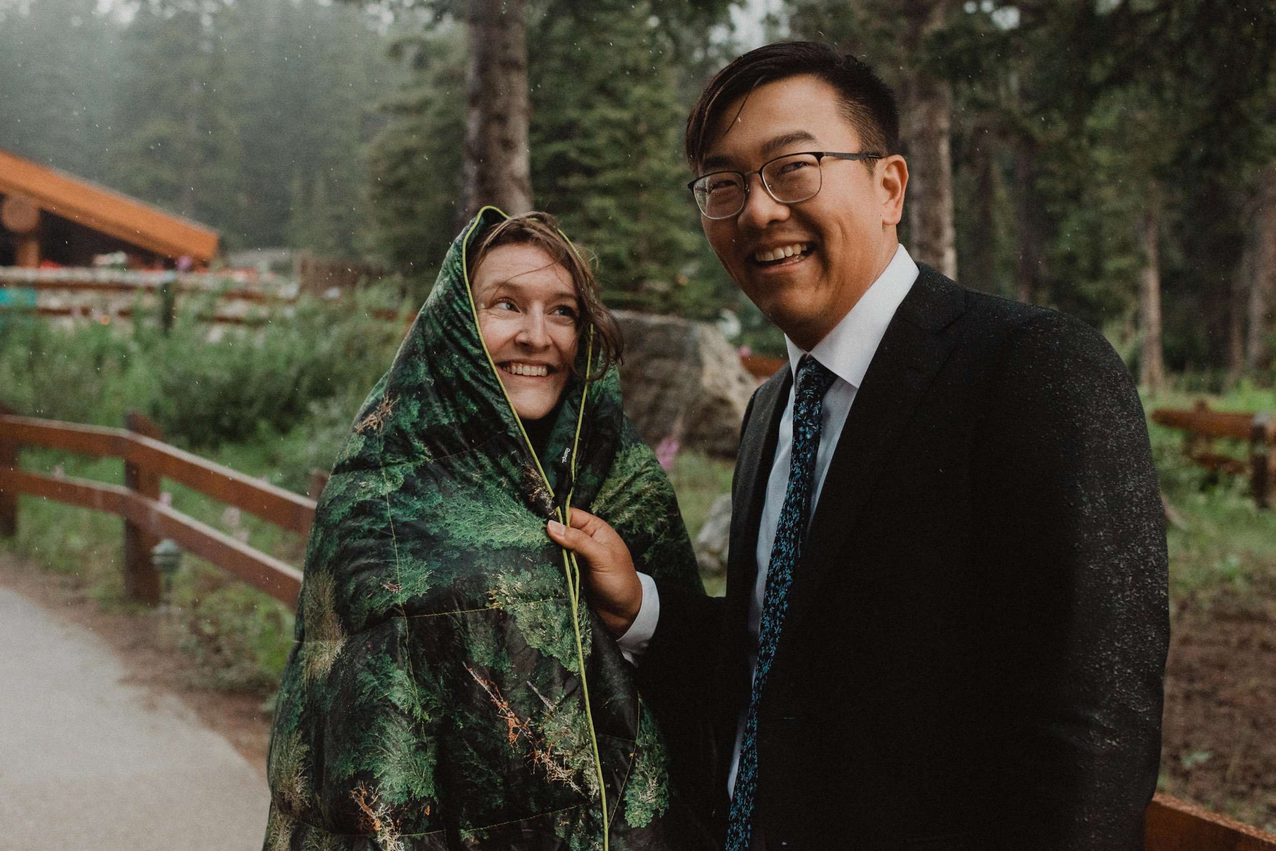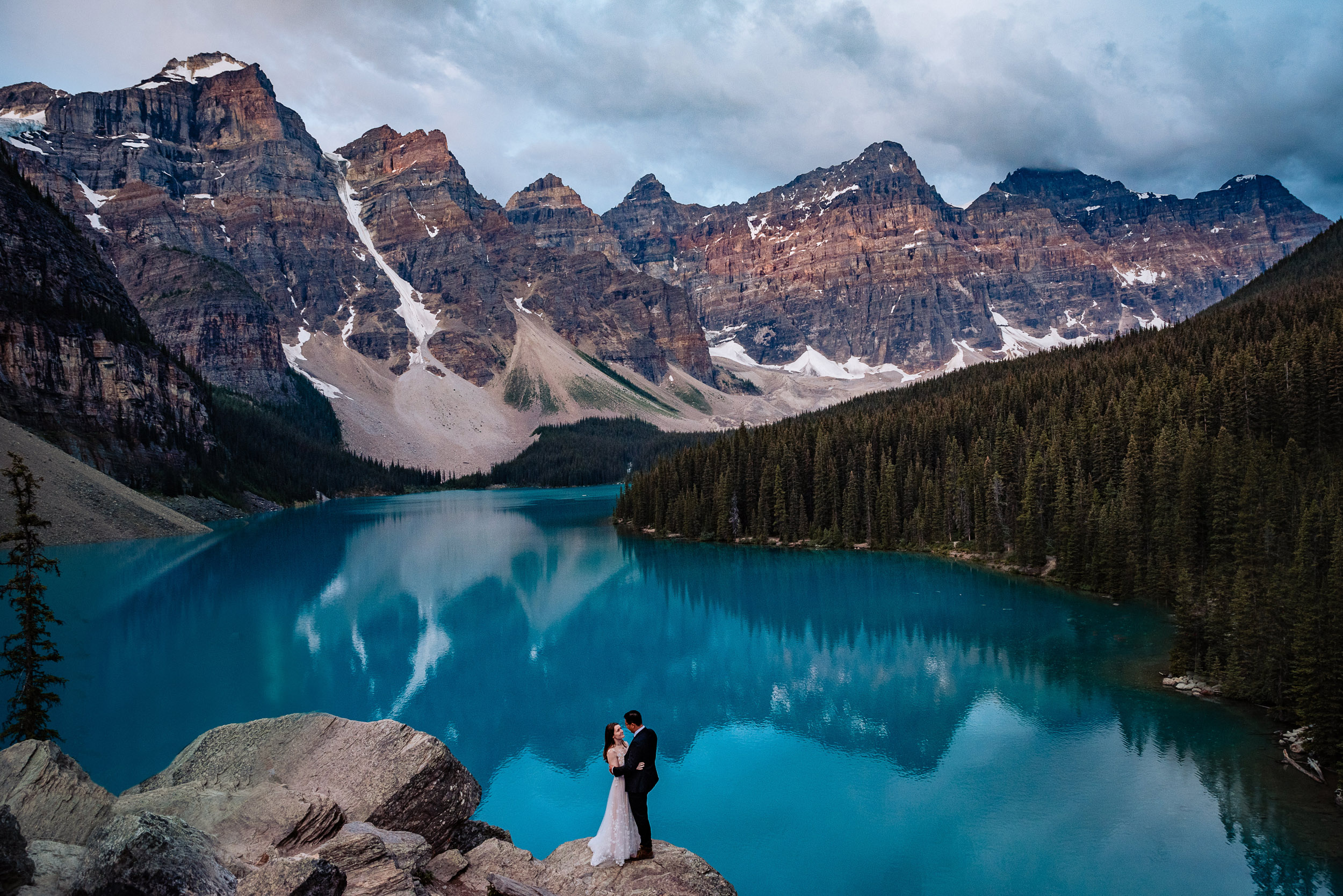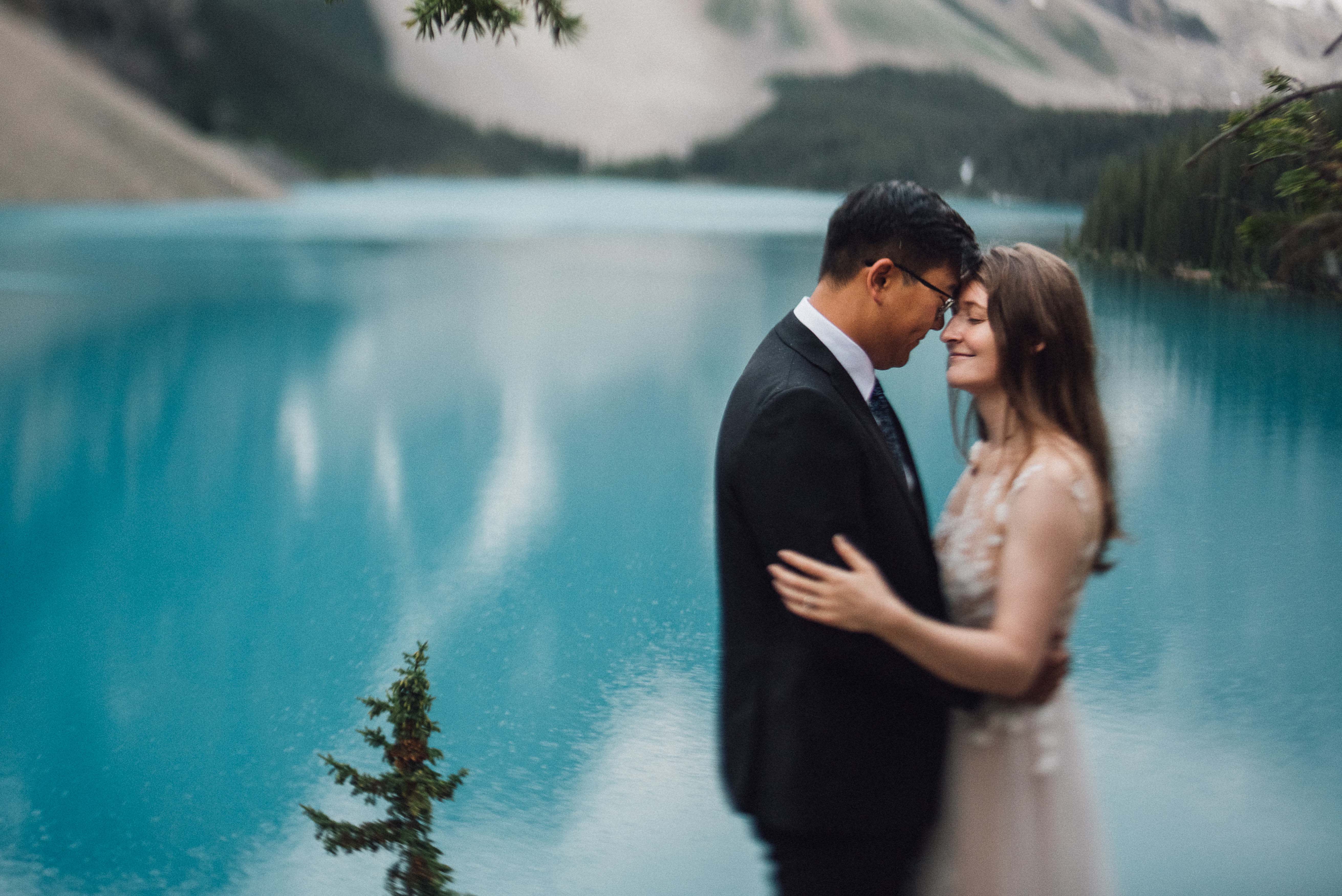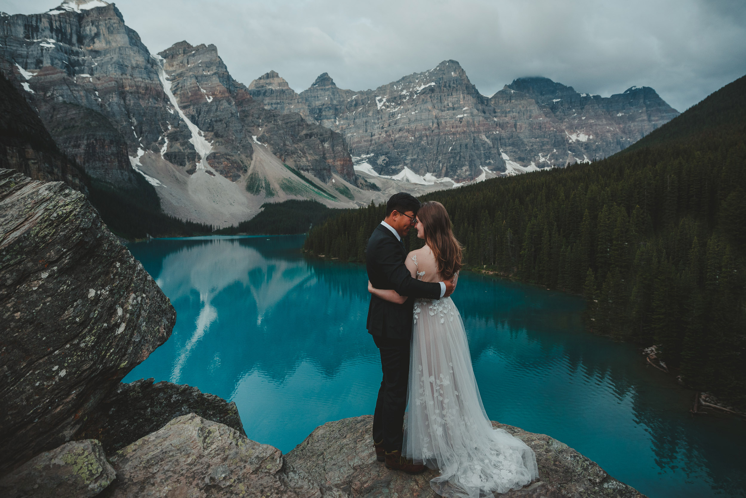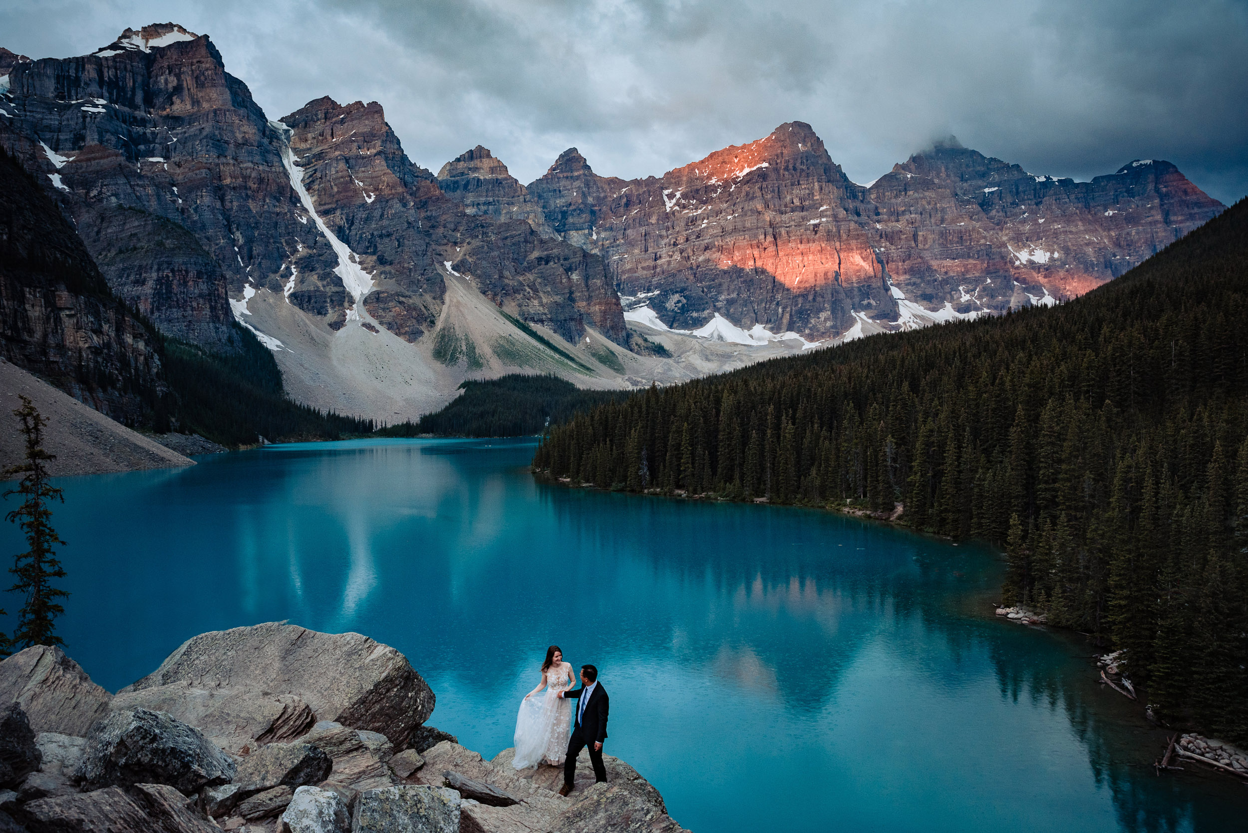 Our wedding day began at sunrise with a hike up the Moraine Lake Rockpile. It had rained all night, but we had a window of calm to enjoy the alpenglow. The weather deteriorated as we were preparing to leave, just in time to celebrate rain on our wedding day and retreat to the warm hotel.