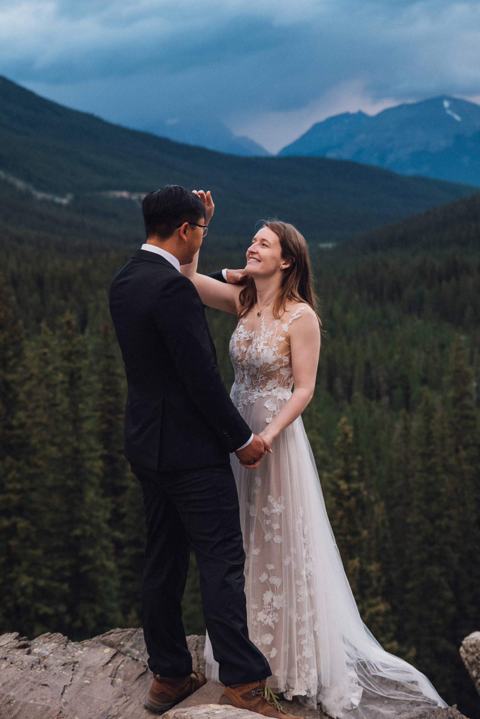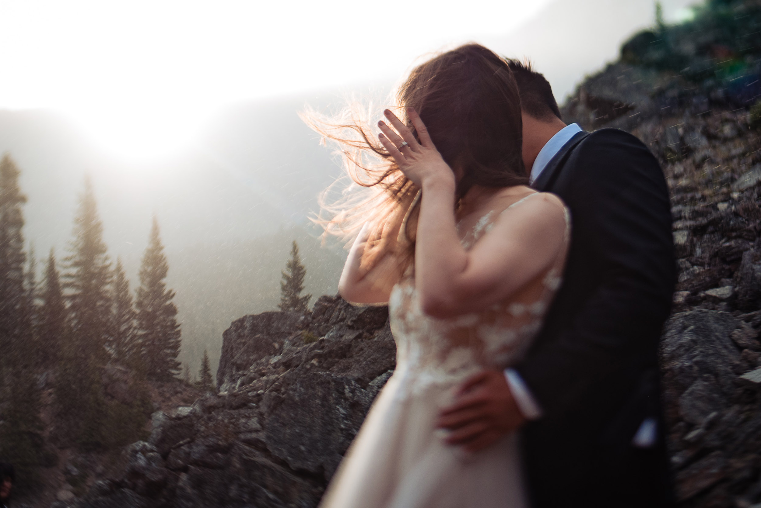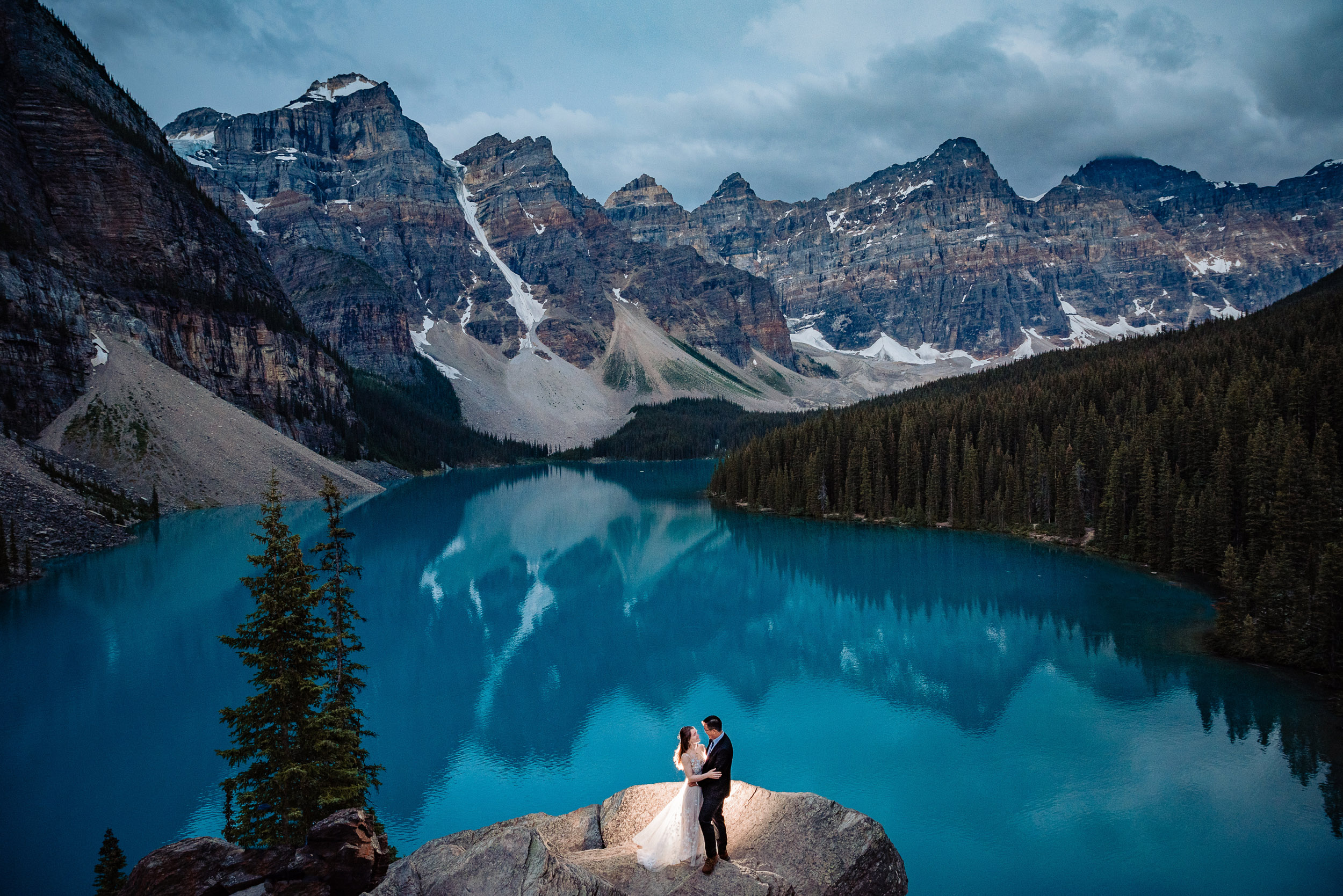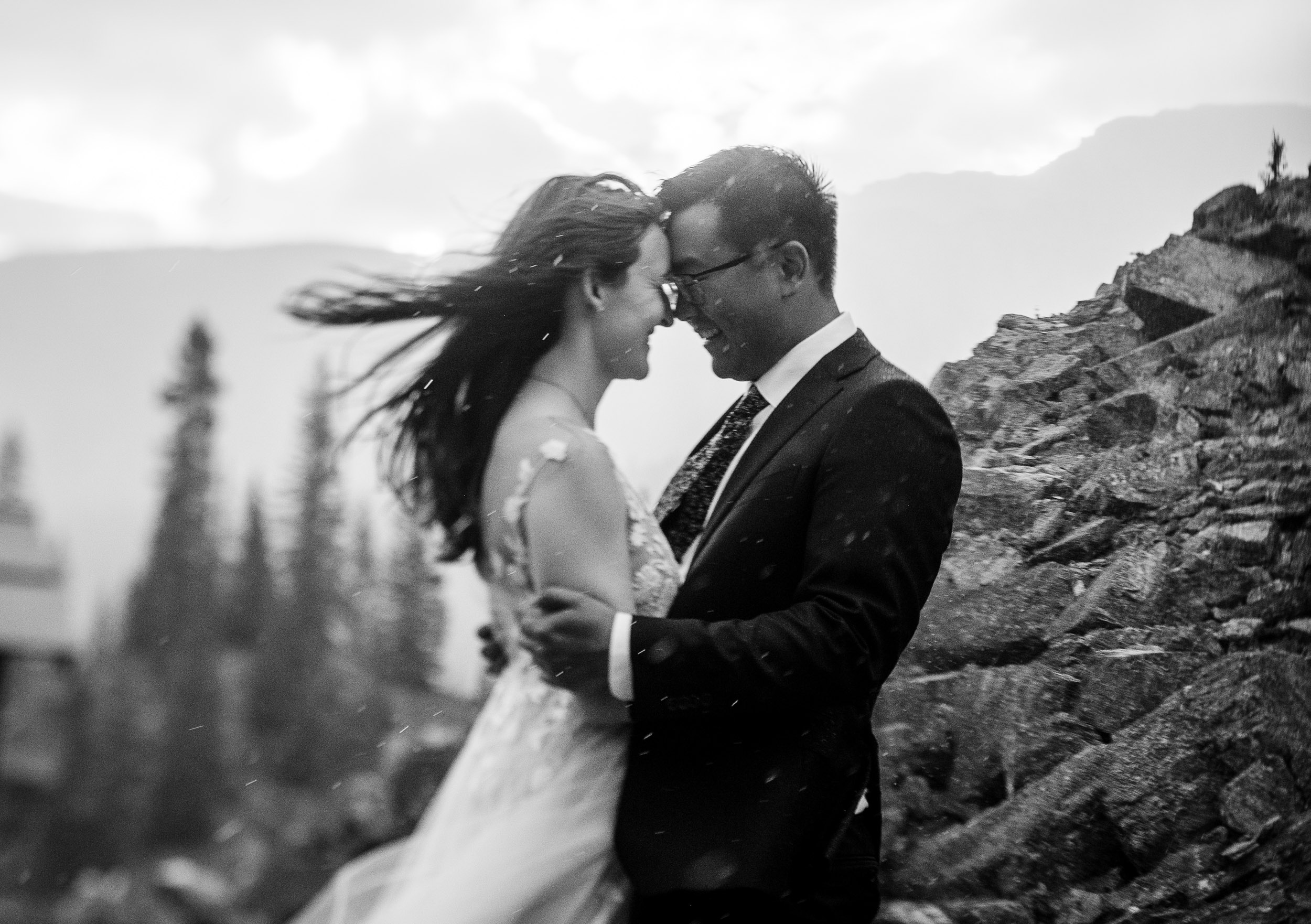 Our wedding day began at sunrise with a hike up the Moraine Lake Rockpile. It had rained all night, but we had a window of calm to enjoy the alpenglow. The weather deteriorated as we were preparing to leave, just in time to celebrate rain on our wedding day and retreat to the warm hotel.