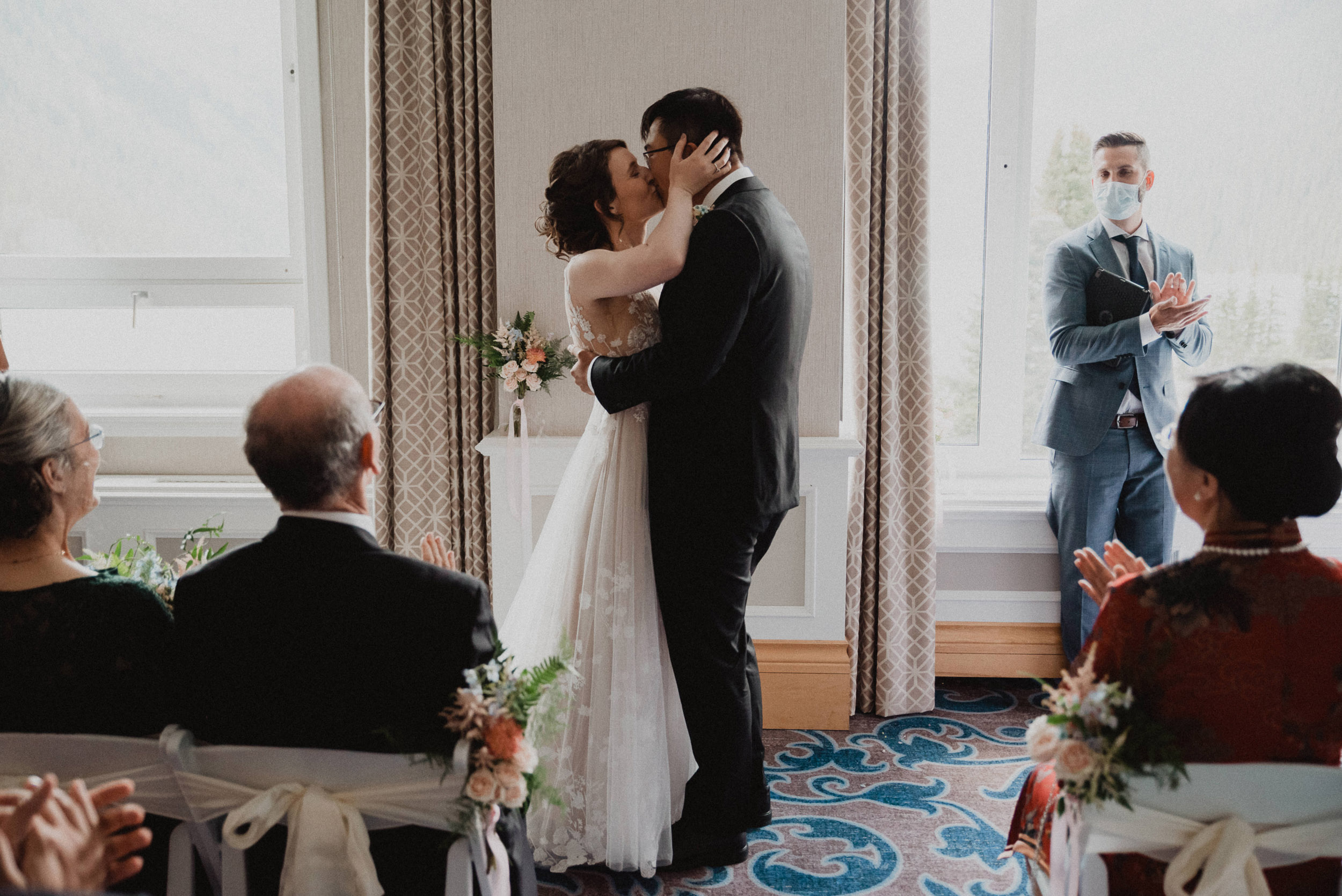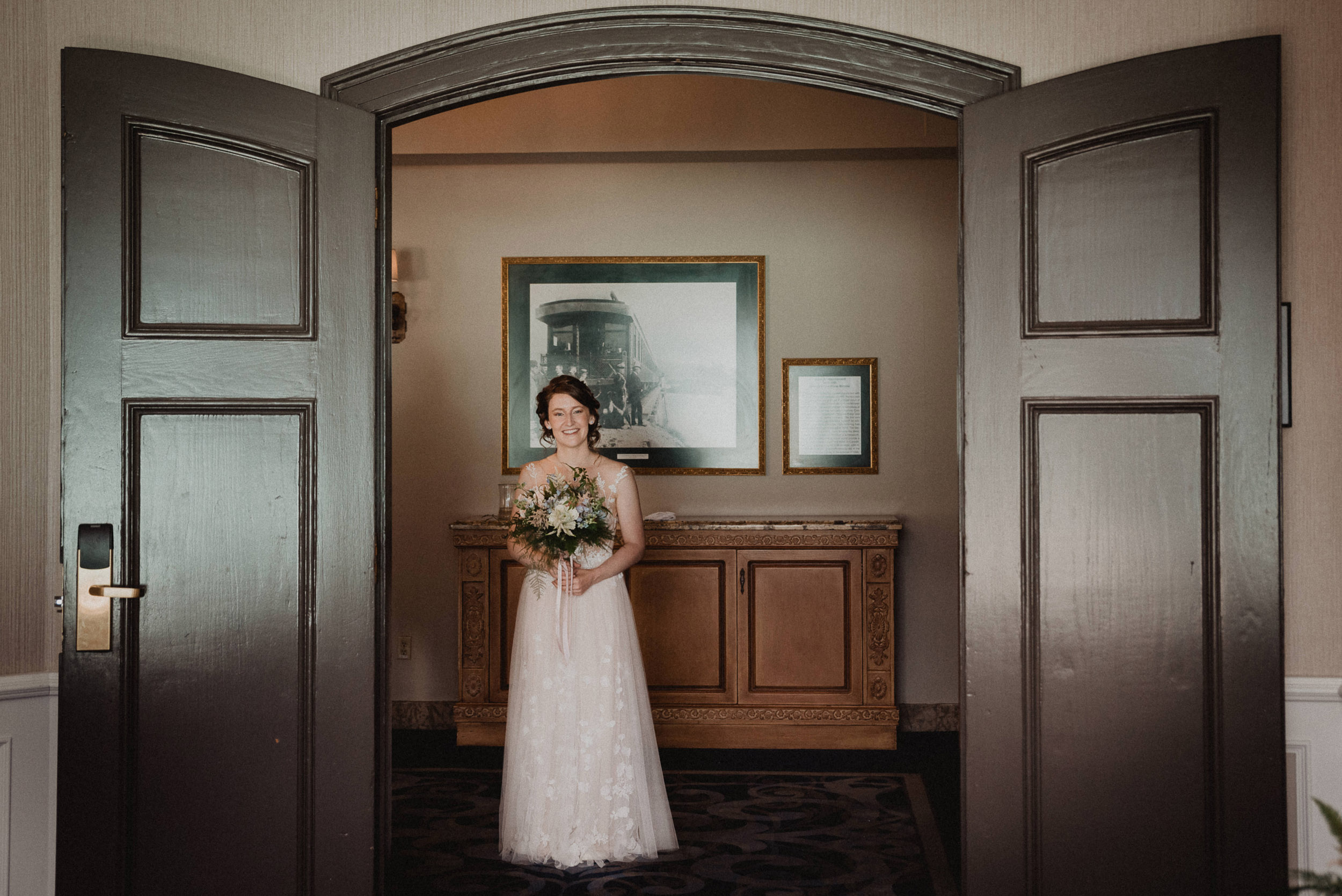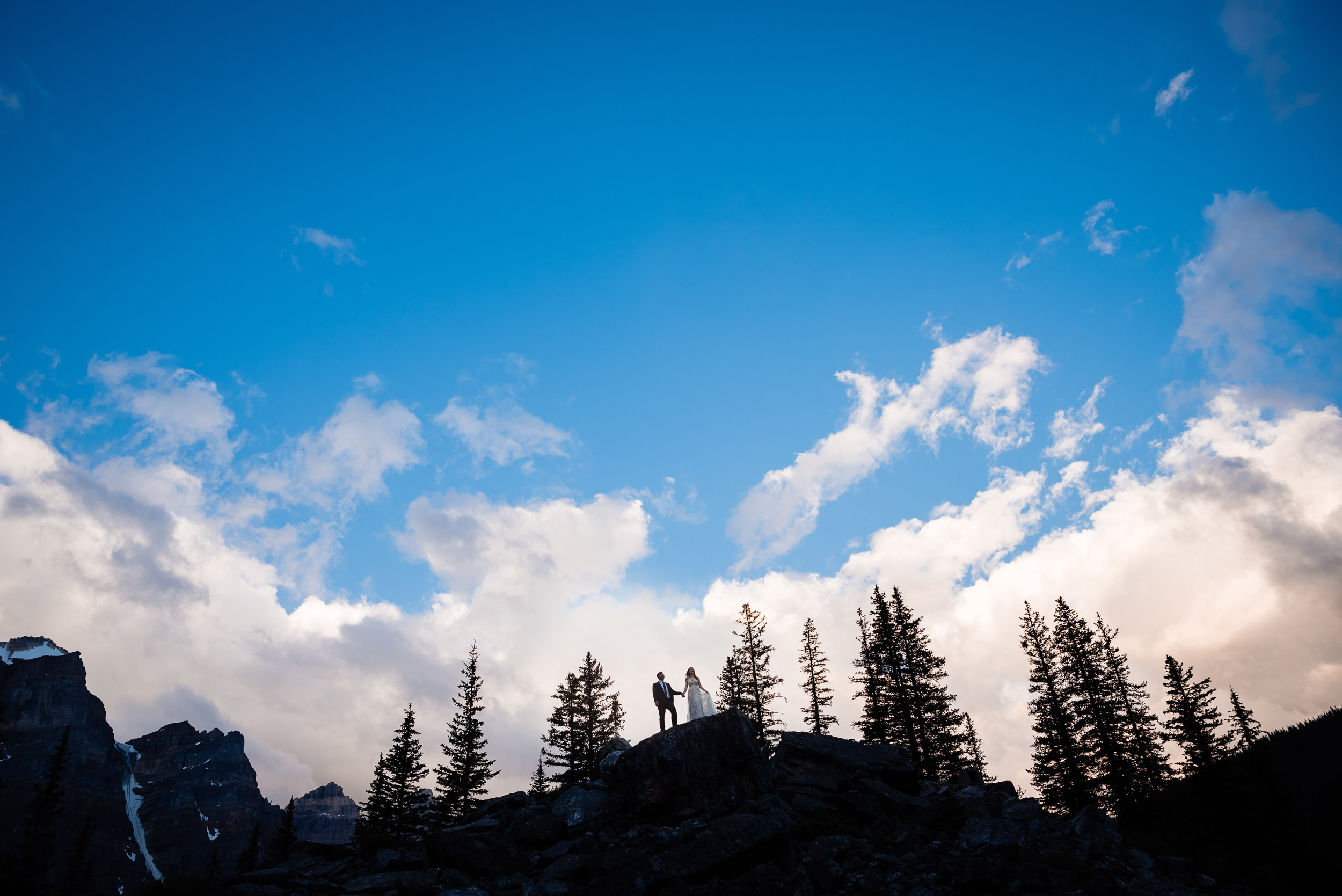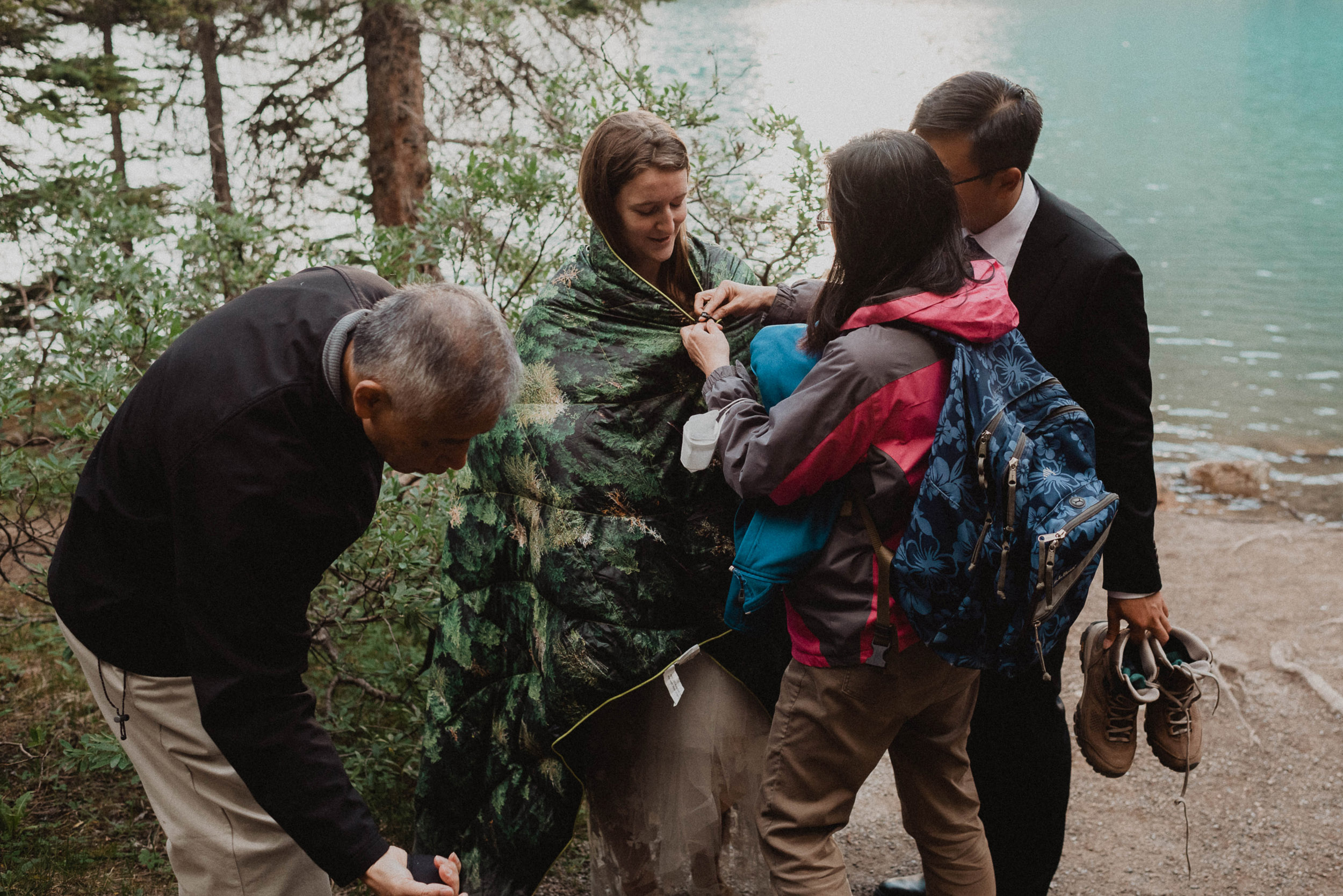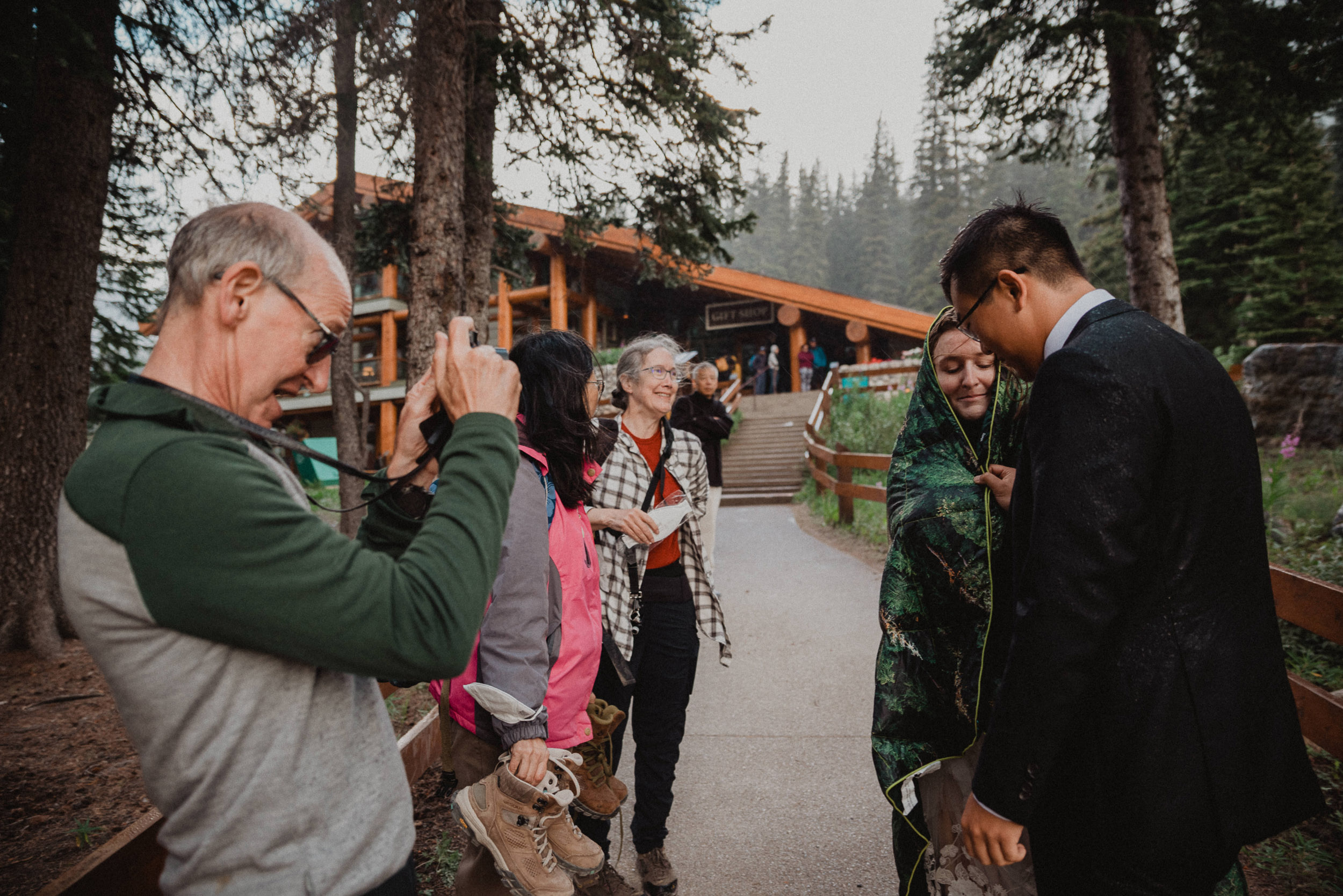 Our wedding day began at sunrise with a hike up the Moraine Lake Rockpile. It had rained all night, but we had a window of calm to enjoy the alpenglow. The weather deteriorated as we were preparing to leave, just in time to celebrate rain on our wedding day and retreat to the warm hotel.