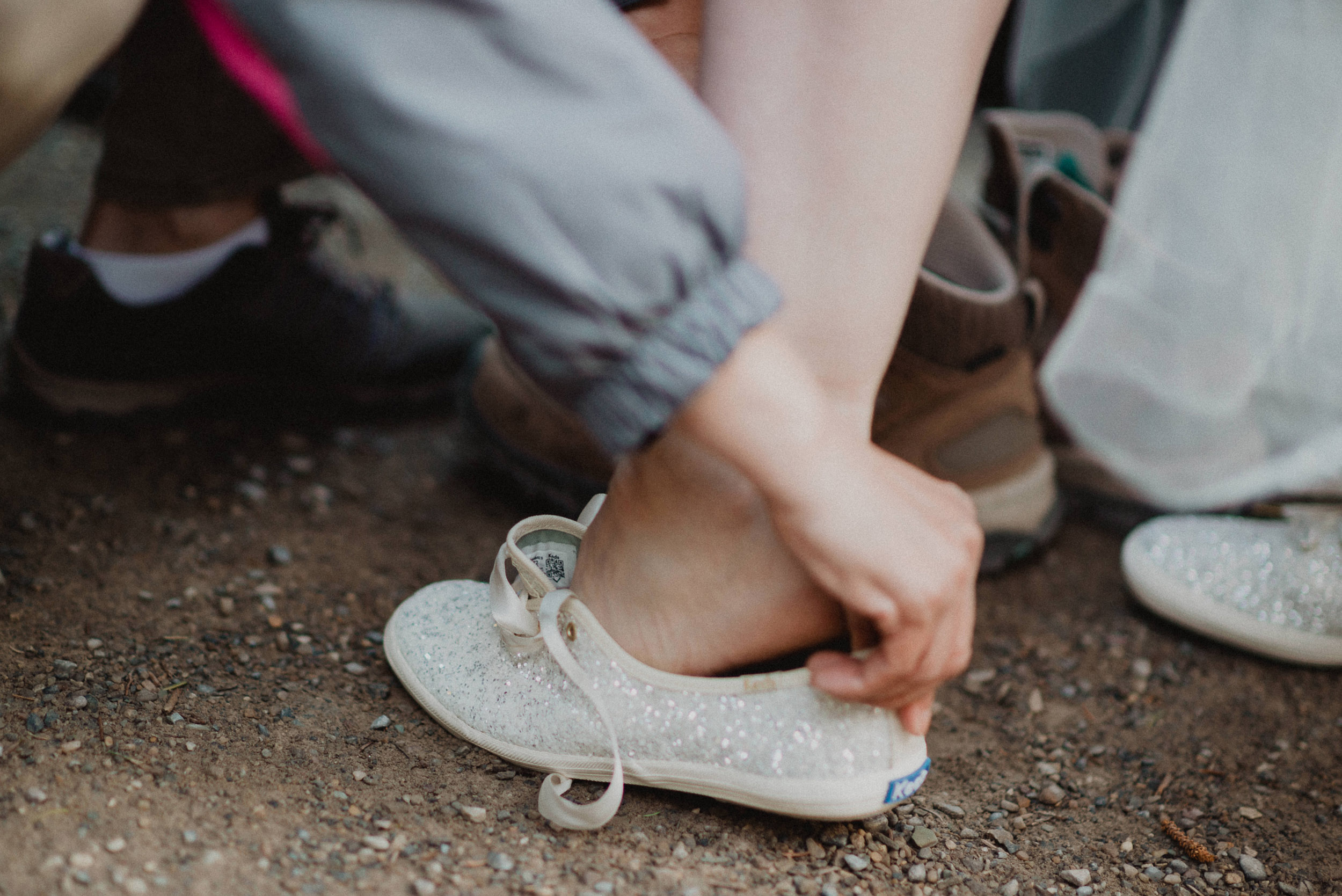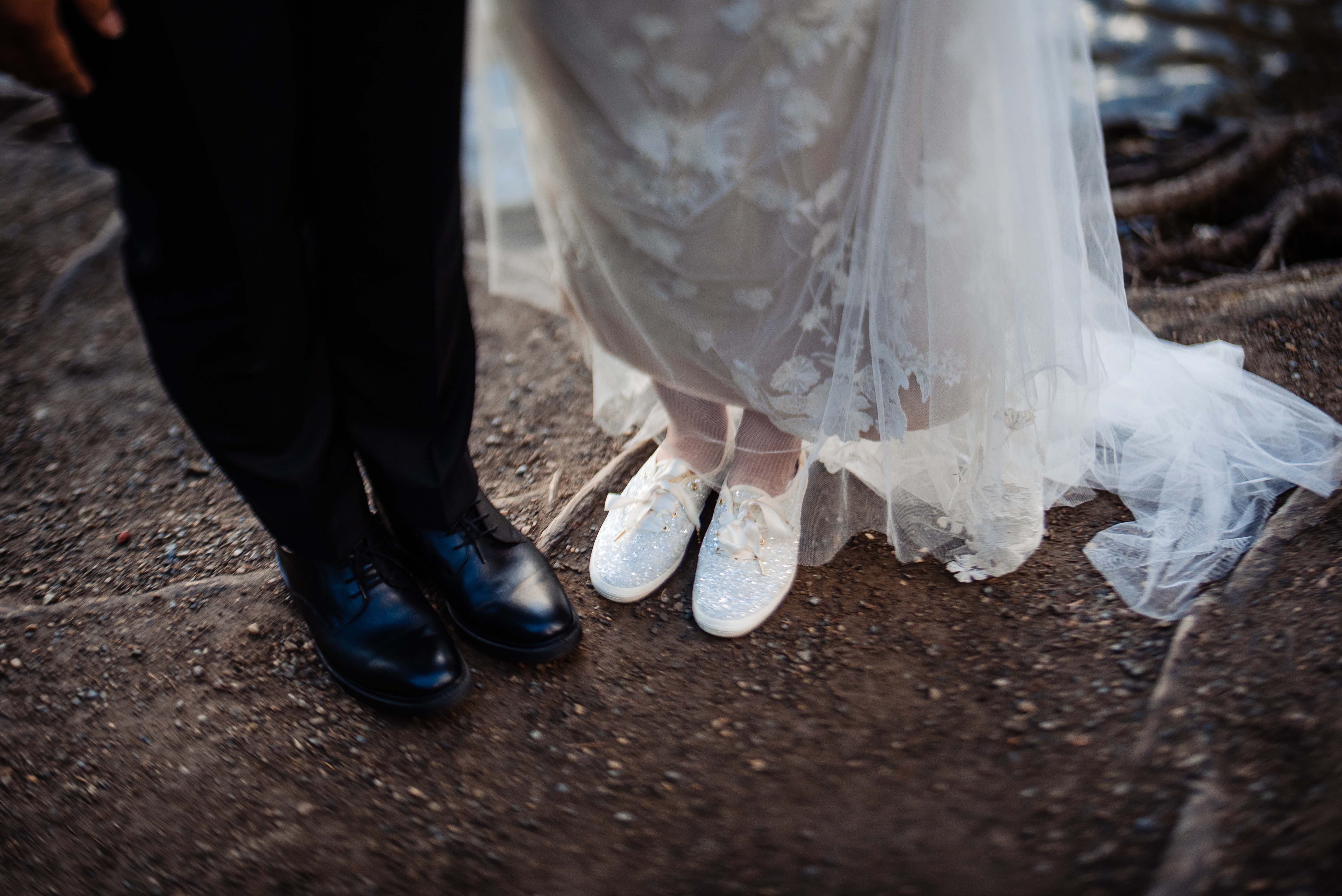 Hiking boots were a must on the wet rocks. We think they really compliment our suit and dress 🙂 We changed back into our usual shoes once we were off the rockpile.
